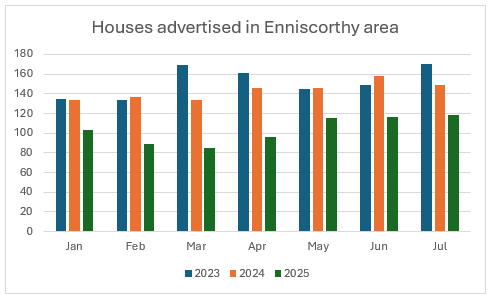 It has been a strong year for Enniscorthy so far. Properties within the town continue to attract solid interest from multiple buyers, regardless of size or type. Two-bedroom starter homes, three-bed family houses, and larger properties are all seeing heightened competition, with well-presented homes moving particularly quickly. The principal challenge for many prospective purchasers remains the lack of available stock. The number of second-hand homes for sale is down 11% compared to this time last year, according to Daft.ie, a further tightening on already low levels in recent years. While stock levels are healthier than they were in 2021, demand still far outstrips supply. In the below graph, as you can see houses advertised is significantly lower than last year.