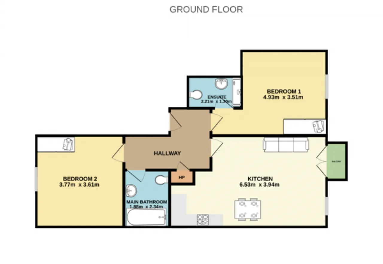 Kitchen/Dining/Sitting Area 6.53m x 3.94m Large and light filled open plan space with the benefit of both a window and French doors that lead to the west facing Juliette balcony. The kitchen area is well-fitted with hand painted floor and eye-level units, a selection of premium kitchen appliances, ceramic tiled flooring and a tiled splashback. The dining/sitting area is an open reception space that benefits from an electric fireplace with marble inset and hand-painted wood surround. Laminate wood flooring runs throughout.