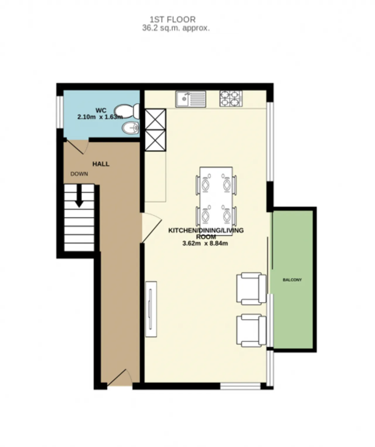 Kitchen/dining/ living area 3.62m x 8.84m This open plan area has a timber floor throughout. Floor to ceiling windows leading out to the balcony and has fitted floor and eye level units with a variety of kitchen appliances.