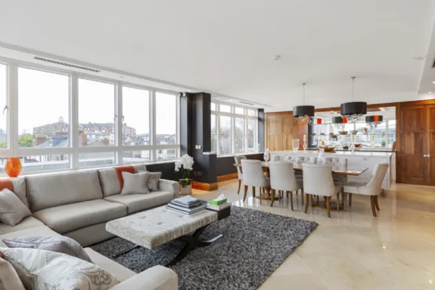 Originally two penthouses and now occupying the entire top floor, a great sense of light and space prevail throughout the interior with high ceilings and floor to ceiling windows ensuring light floods in from all four aspects and with the benefit of air conditioning throughout. The property is further complemented by having four terraces offering sunshine at different times of the day. There are also four designated underground car parking spaces and a two secure storage lock ups. Should one wish, the property would easily convert back into two apartments, subject to the necessary approvals.