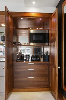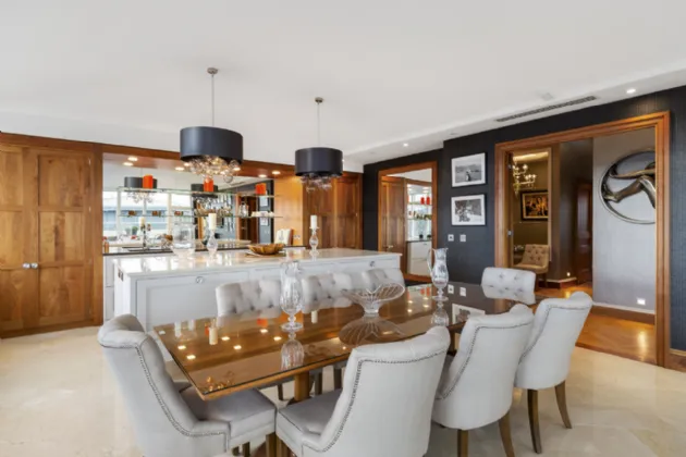 Kitchen / Dining / Living Room: a lovely bright open plan space facing south and west with stunning kitchen cabinets, mirrored pantry cupboard, four Fisher & Paykel integrated pull out drawer fridges, Miele integrated dishwasher, Neff four ring induction hob, automatic rising extractor fan, Miele oversized oven, hot water tap, marble work surfaces, walnut larder with Miele microwave and pull out drawers, walnut glass cabinet. Living area with gas fire, recessed lights, porcelain floor, under floor heating and door to the sunny terrace. Air conditioning.