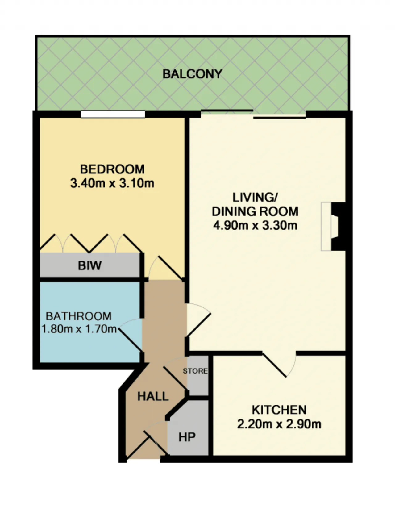 Bedroom 3.40m x 3.10m Carpet flooring, fitted wardrobes and book shelf, window overlooking balcony.