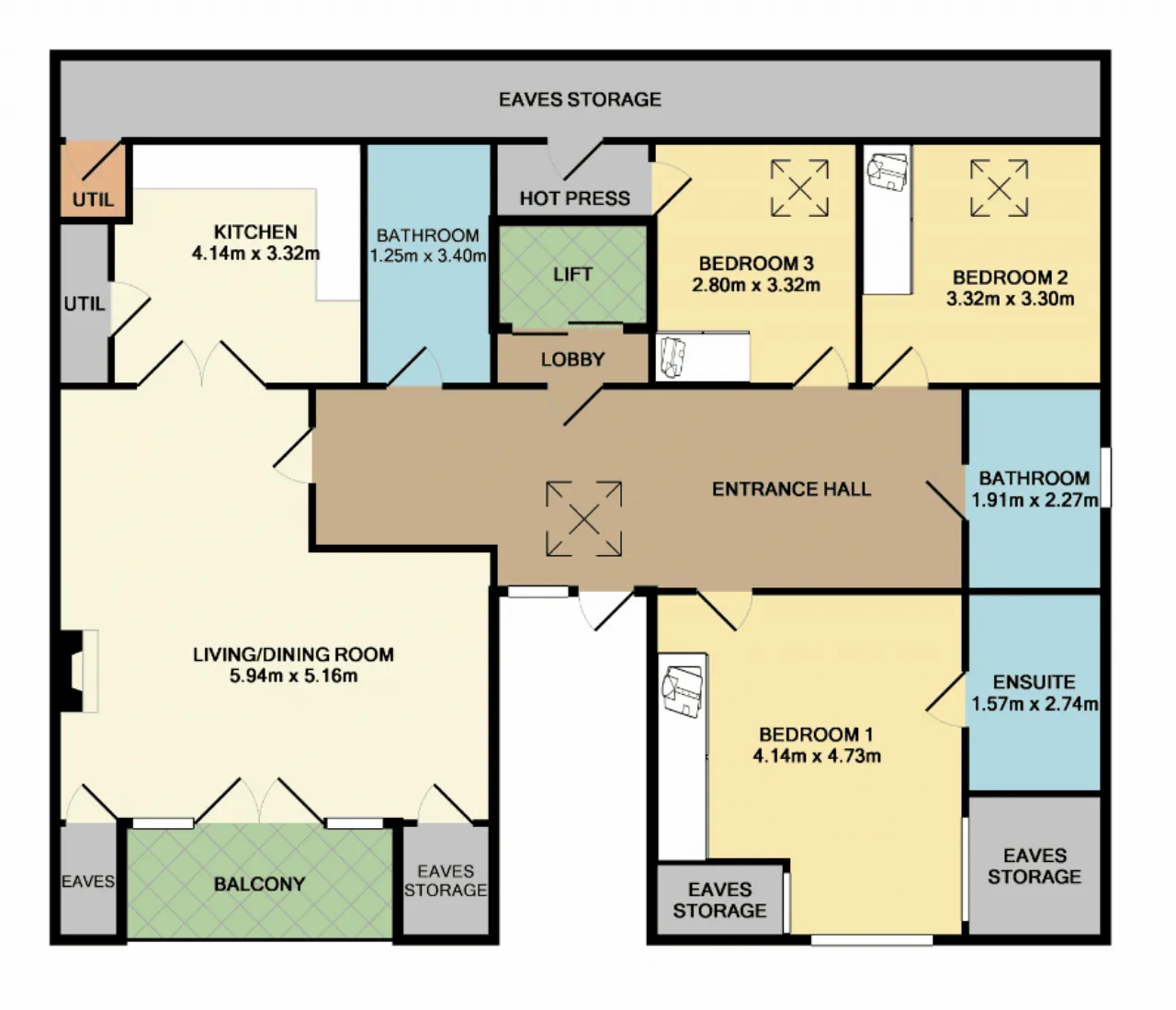 Bedroom 2 3.32m x 3.30m Laminate flooring, built-in wardrobes, TV point, LED lighting, Velux windows, hot press with immersion heater and storage shelving. There is also access to full length of apartment eaves storage area.