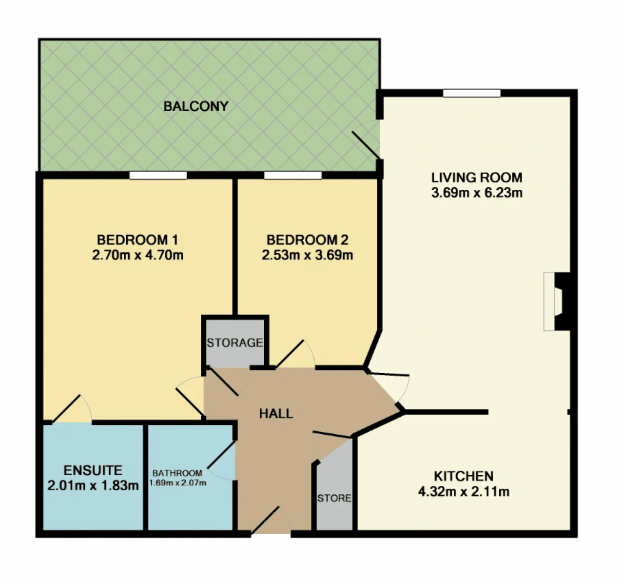 Bedroom 1 2.70m x 4.70m Double bedroom with bulit in wardrobes, windo over balcony, wooden floor