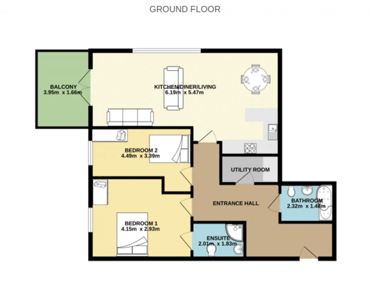 There are two generous double bedrooms, both with fitted wardrobes. The main bedroom further benefits from a fully tiled en-suite bathroom, while a spacious main bathroom with contemporary sanitary ware and a modern P-shaped shower completes the accommodation. This superior quality apartment combines energy-efficient design with a high level of comfort, making it an excellent modern home.