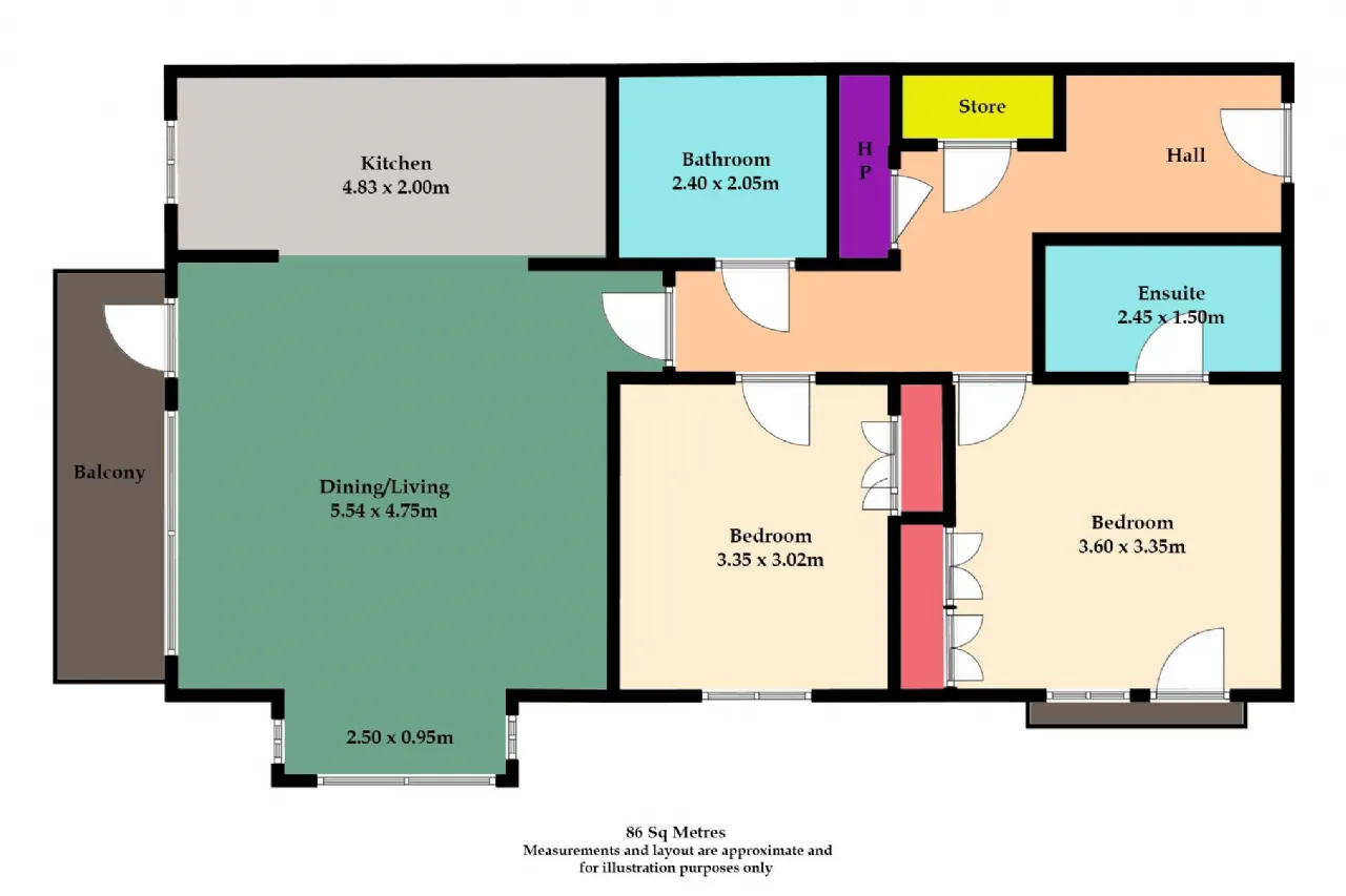 The accommodation presents with an open plan living / dining / kitchen arrangement with a large balcony showcasing the well maintained common areas. There are two spacious double rooms, one with an ensuite, a storage closet and main bathroom.