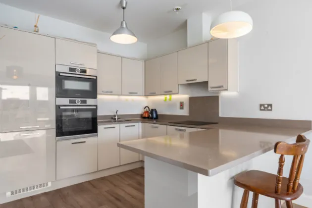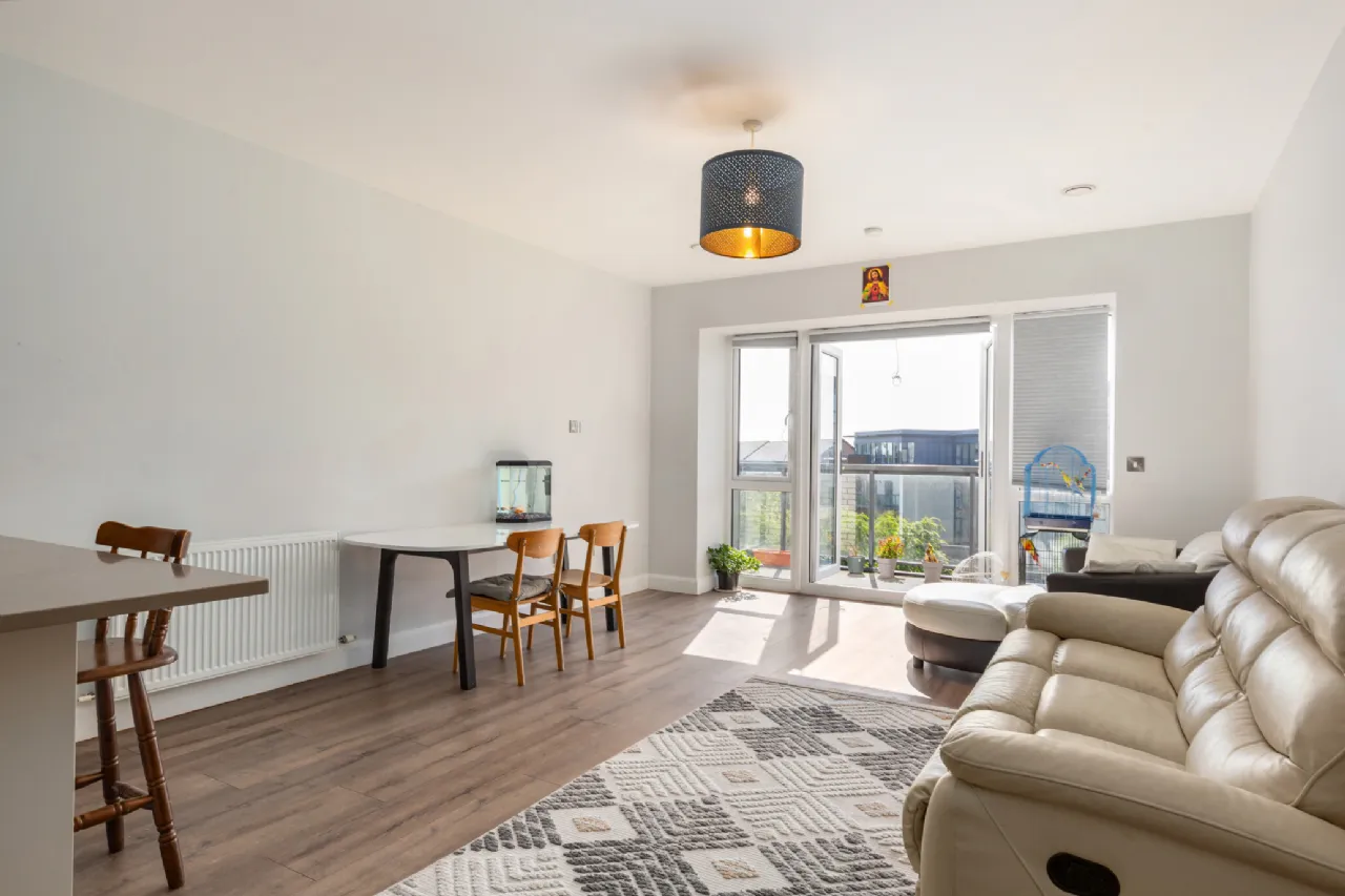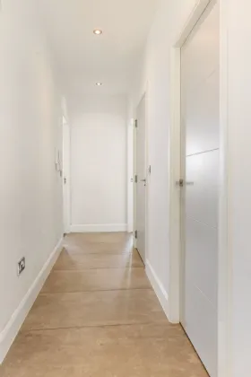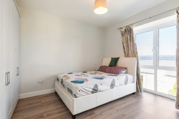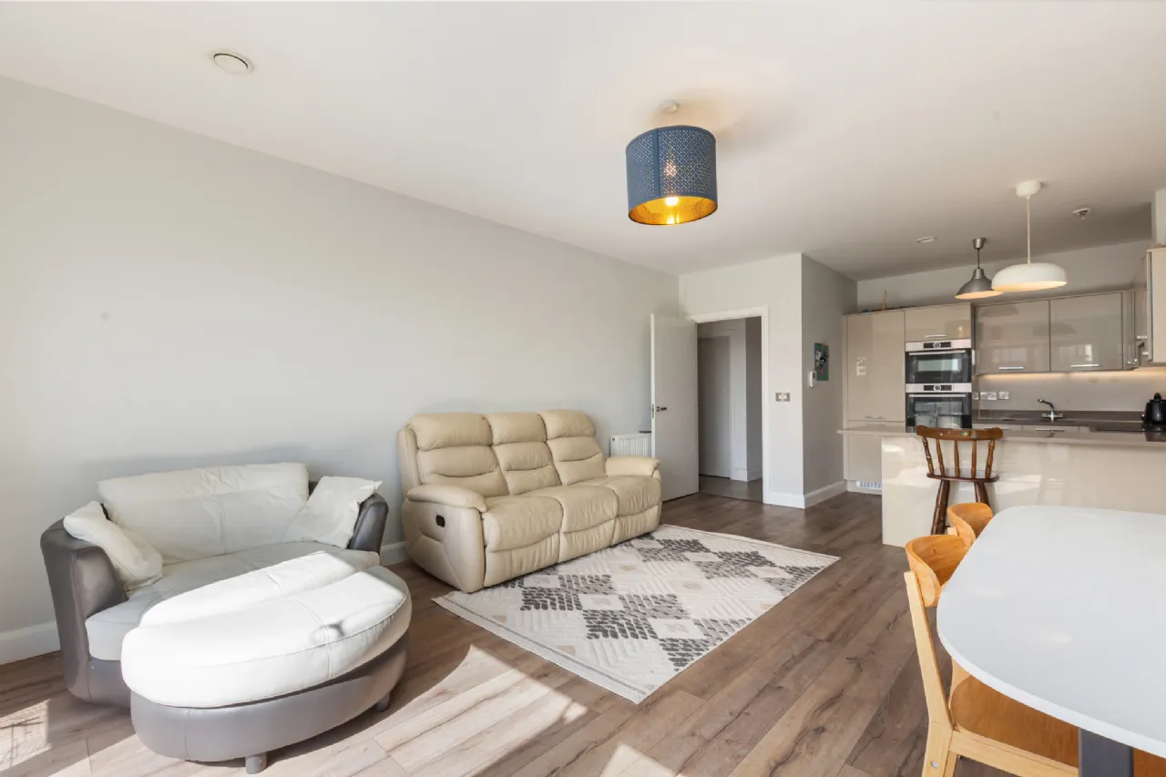 The accommodation is thoughtfully designed and comprises an entrance hall with a utility area and separate storage cupboard/office, a family bathroom with Jack & Jill access doors, and a spacious open-plan kitchen, living, and dining room. This bright and airy space is bathed in natural light, and features a door leading to a large southwest-facing balcony, perfect for basking in sunlight throughout the day. The master bedroom boasts an ensuite, while the second bedroom is fitted with built-in wardrobes and has convenient access to the family bathroom. With ceiling heights of 8 feet 8 inches, the apartment offers an exceptional sense of space.