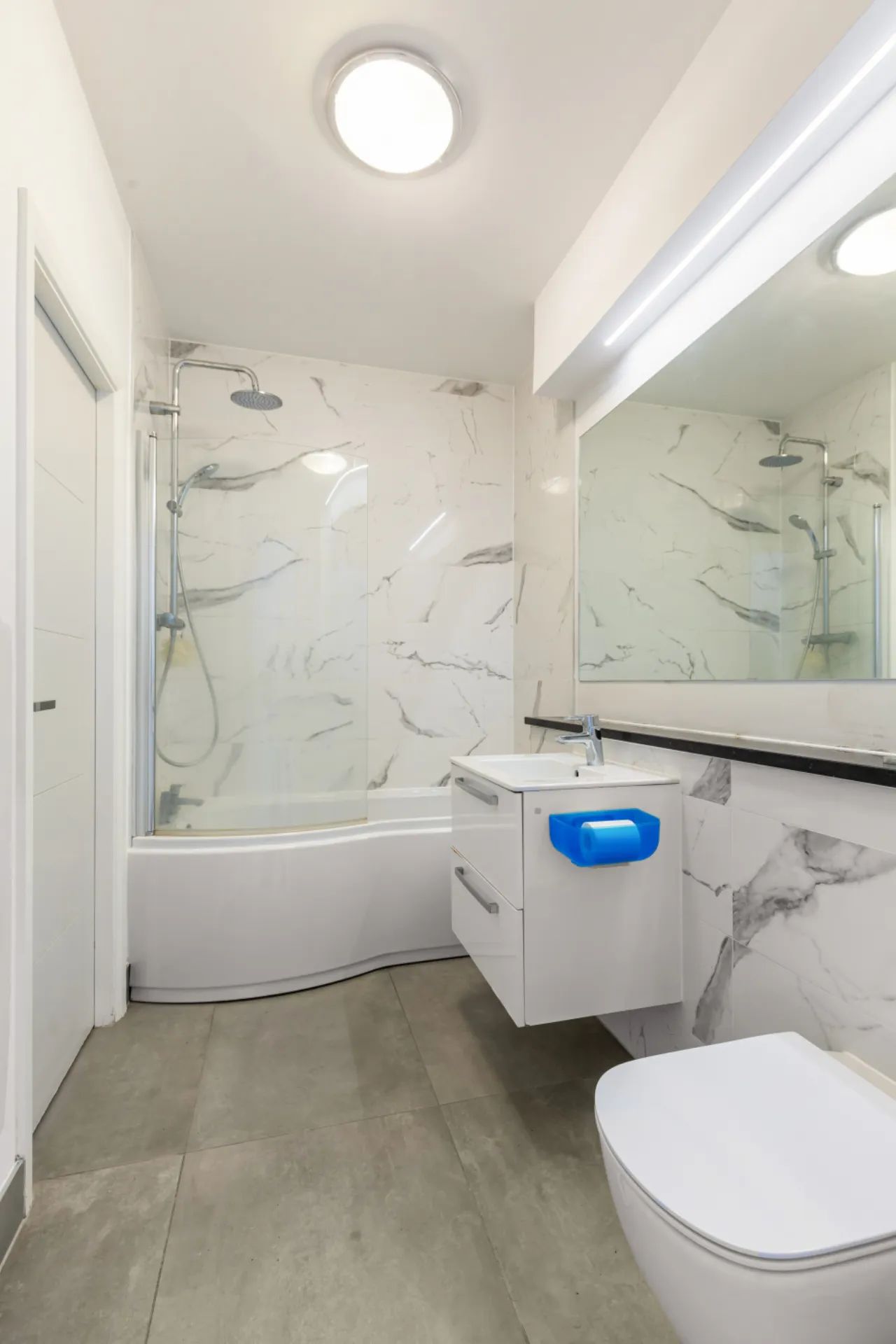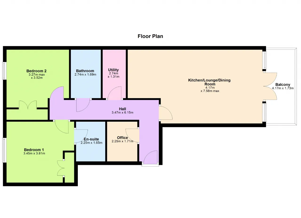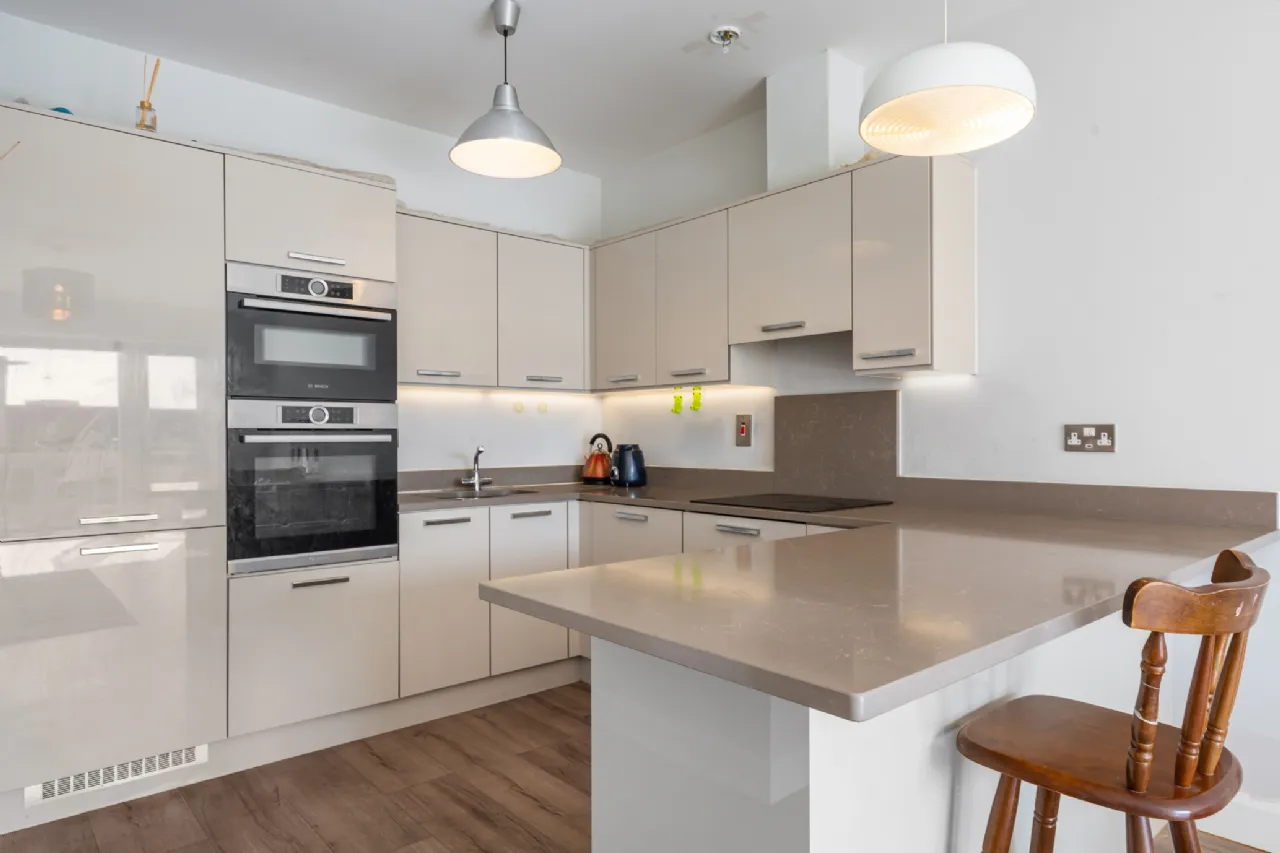 The accommodation is thoughtfully designed and comprises an entrance hall with a utility area and separate storage cupboard/office, a family bathroom with Jack & Jill access doors, and a spacious open-plan kitchen, living, and dining room. This bright and airy space is bathed in natural light, and features a door leading to a large southwest-facing balcony, perfect for basking in sunlight throughout the day. The master bedroom boasts an ensuite, while the second bedroom is fitted with built-in wardrobes and has convenient access to the family bathroom. With ceiling heights of 8 feet 8 inches, the apartment offers an exceptional sense of space.