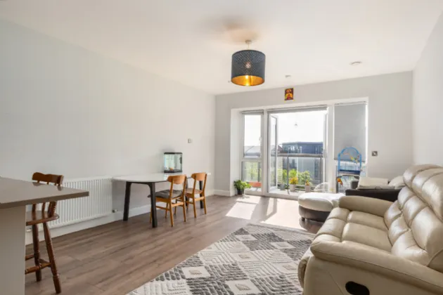 Living/Dining room: laminate wood flooring, central light, double patio doors onto south facing balcony
