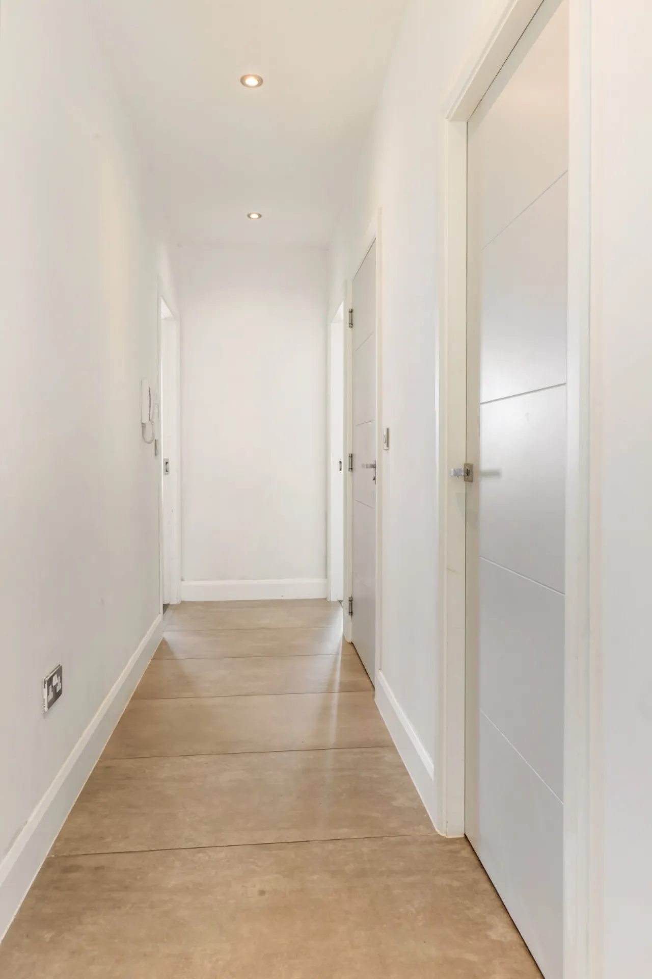 Bedroom one: 3.45m x 3.81m laminate wood flooring, central light, built-in wardrobes, door to:-