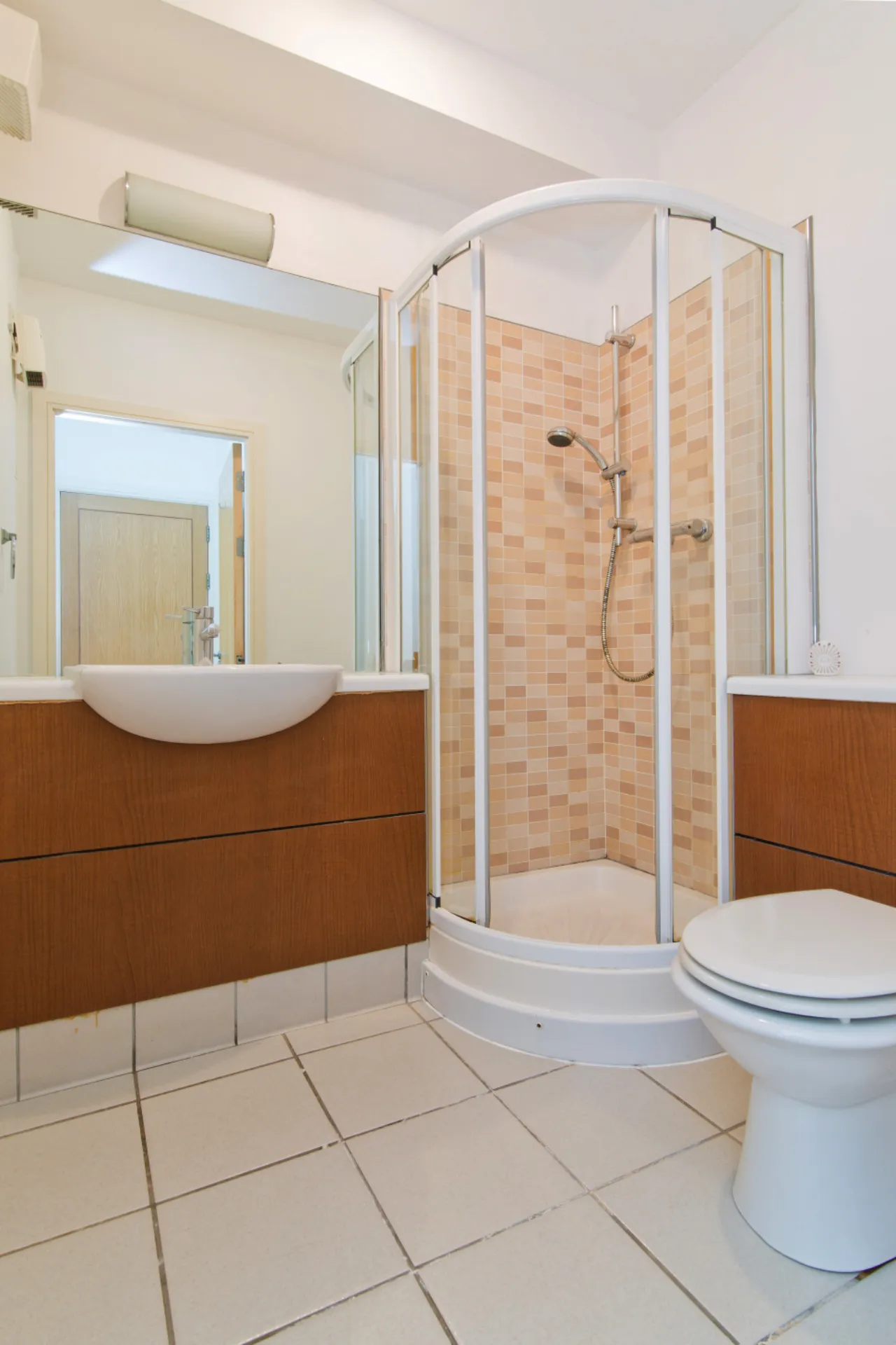 Bathroom 1.796m x 3.179 Tiled main bathroom with, wc, whb, bath and shower, with a large wall-mounted mirror.