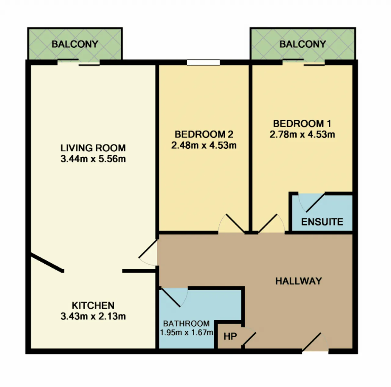 Bedroom 1 2.78 x 4.53 Laminate flooring, built in wardrobes, leading to balcony.