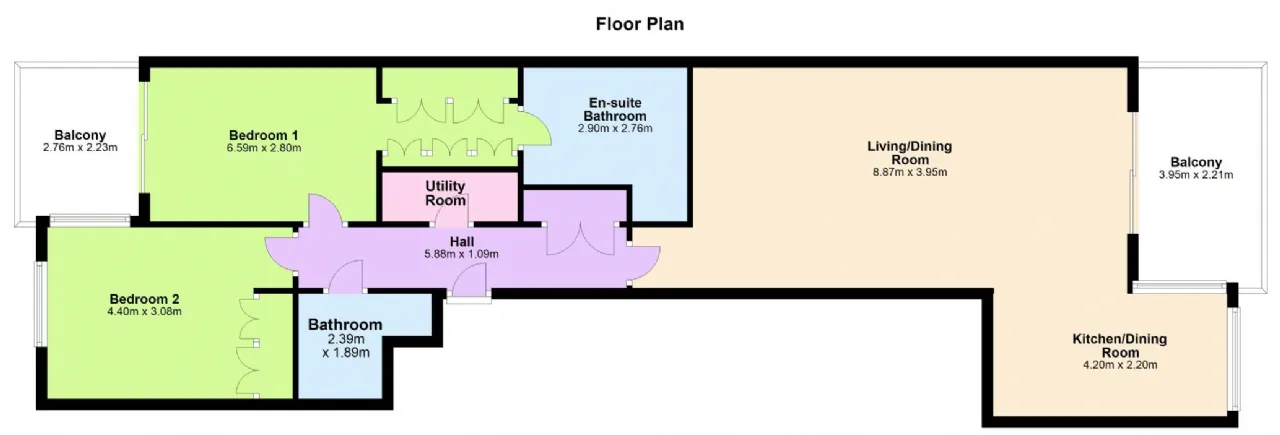 Bedroom 1 Large double room with wide plank solid wood flooring, floor to ceiling window and door leading out to balcony. Walk through wardrobes by Newcastle Design with fitted hanging and shelving storage.