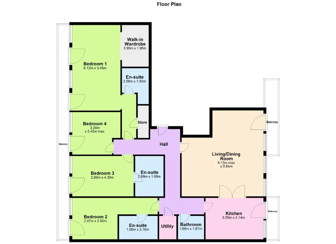 Bedroom 2 2.97m x 2.00m Double bedroom, engineered wooden flooring, built in wardrobes, access to the balcony and access to;