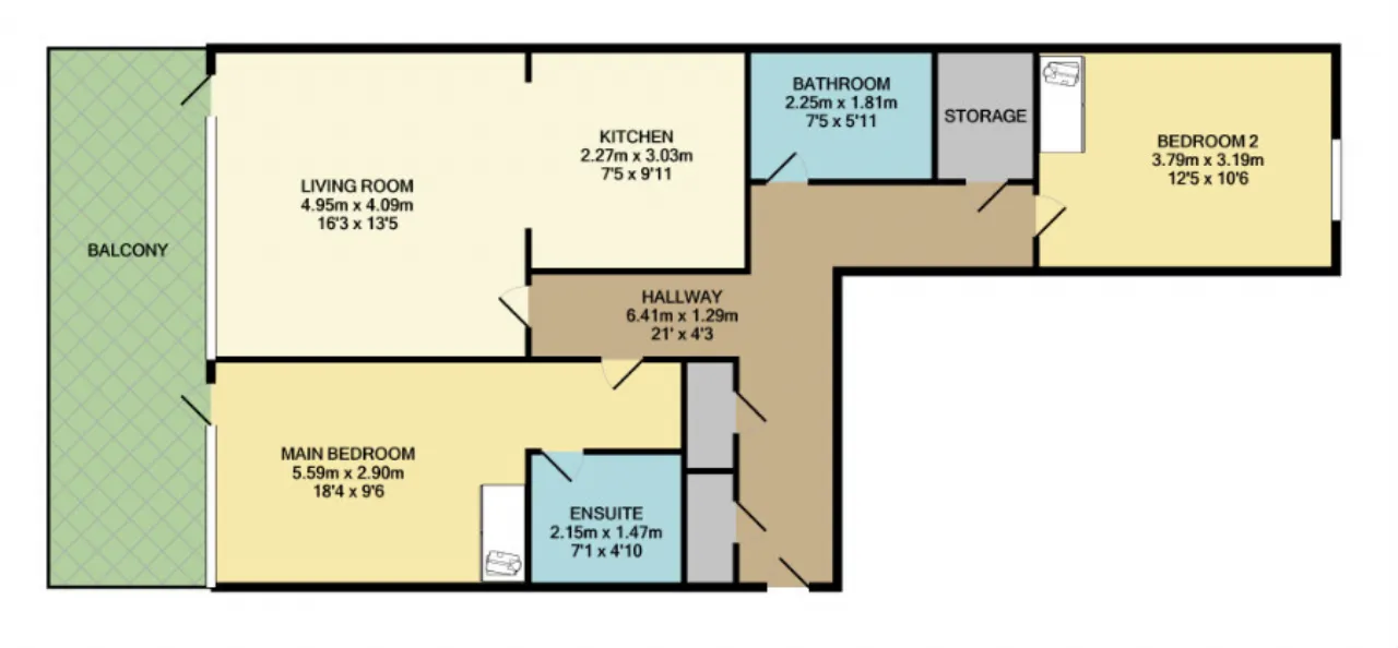 The main bedroom also benefits from floor-to-ceiling windows, complete with a stylish ensuite. A second double bedroom with built-in wardrobes, a large main bathroom, utility area, and additional storage complete the thoughtfully designed layout.