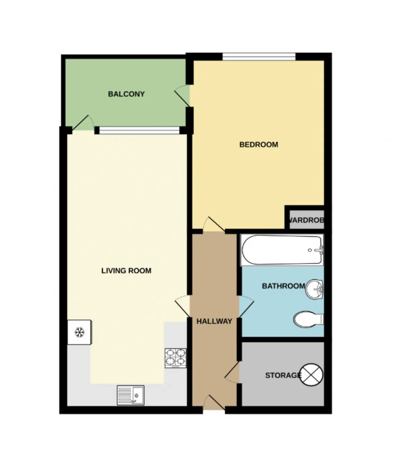 Lounge/Kitchen 6.3m x 2.9m Modern cream gloss fitted kitchen with range of wall and floor units, worktops, tiled splashback, built in oven, hob, extractor fan, Laminate wood flooring. Floor to ceiling windows and glass panelled door accessing west facing balcony.
