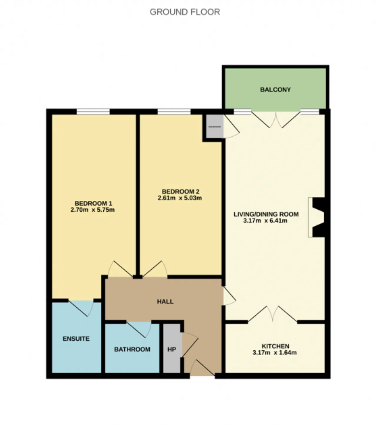 Bedroom 1 2.70m x 5.75m Carpet flooring and a built-in wardrobe.