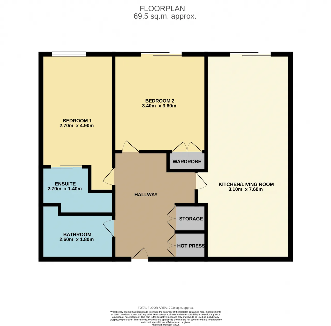 Bathroom: Fully tiled, wc, wash hand basin, bath with overhead shower, heated towel rail.