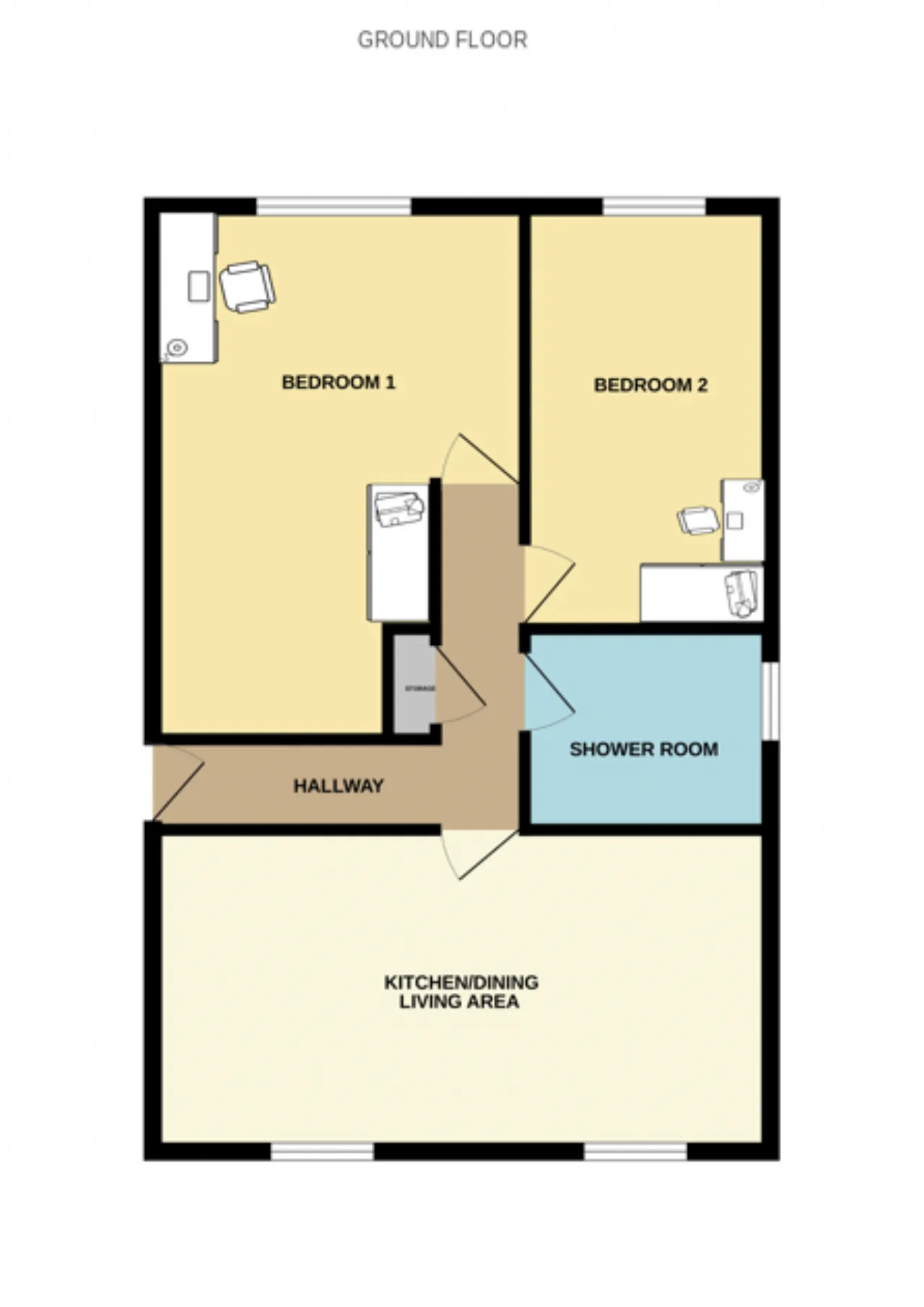 The accommodation is thoughtfully laid out and begins with a welcoming entrance hallway that leads through to a bright, south-west facing open-plan living, dining, and kitchen area at the front of the property. Two well-proportioned bedrooms are positioned at the rear of the apartment, providing quiet and private retreats, and the shower room completes the internal layout.