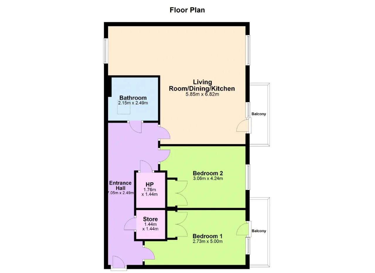 Bedroom 1 2.73m x 5.00m With wood flooring throughout and fitted wardrobe. Private balcony.