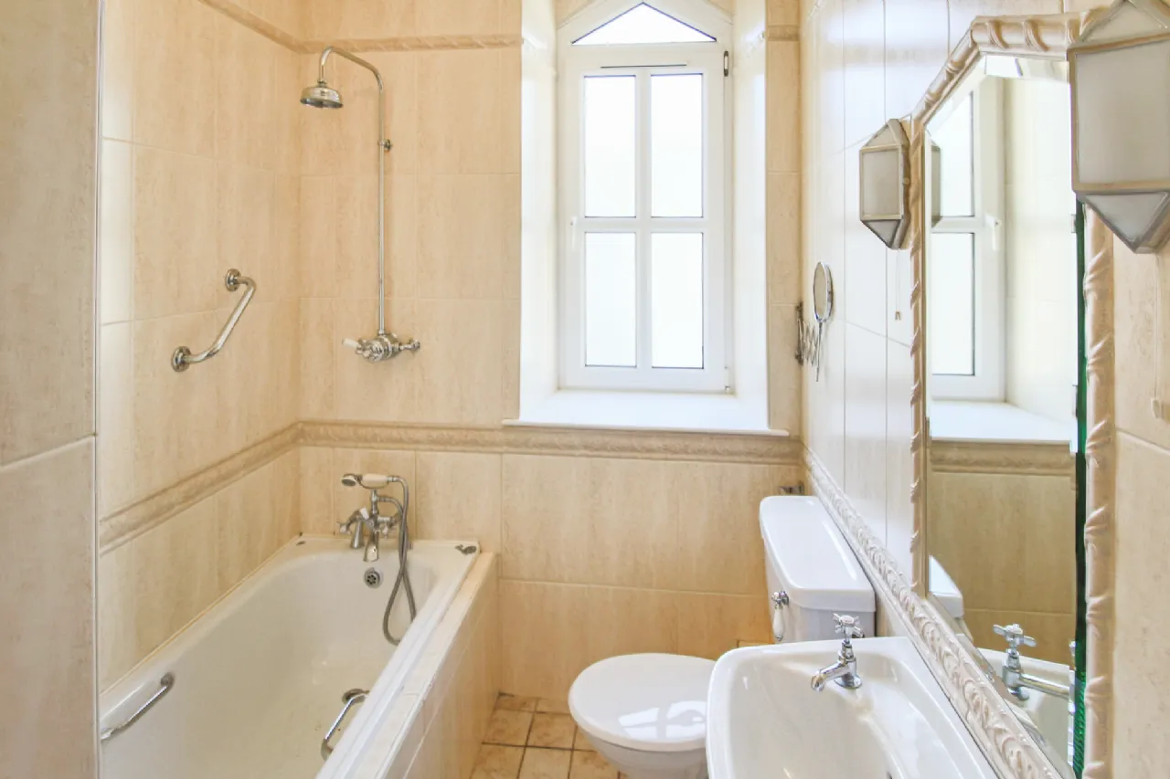 Bathroom 2.25m x 1.89m Full tiled, bath with shower attachment, window, wc&whb, wall mirror & lights, Dimplex wall heater, shaver point.