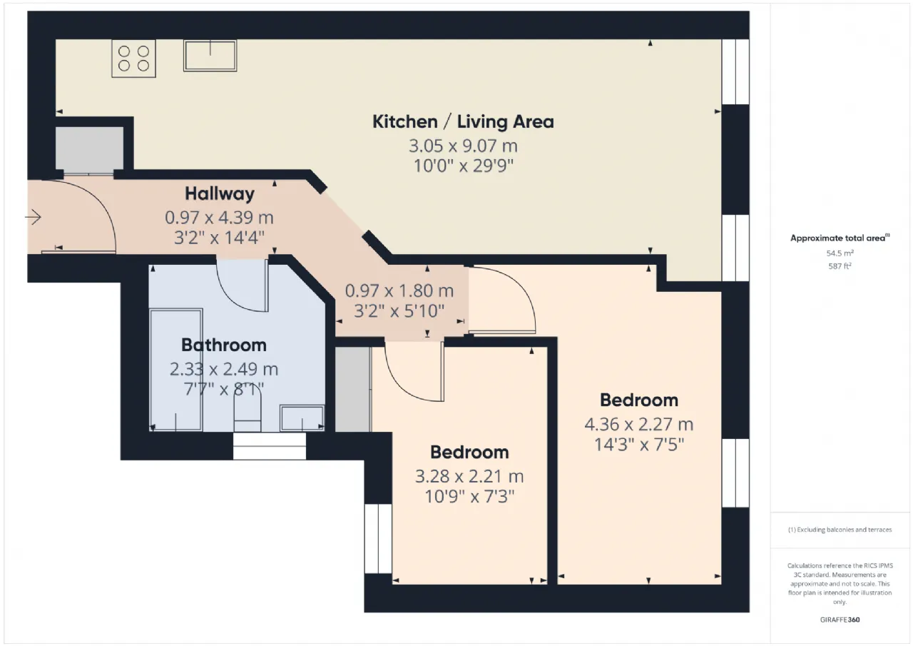 Kitchen/Living Area 3.05m x 9.07m Kitchen: Tiled floor; tiled back splash; integrated hob and oven. Living Area: Laminate floors; river views.