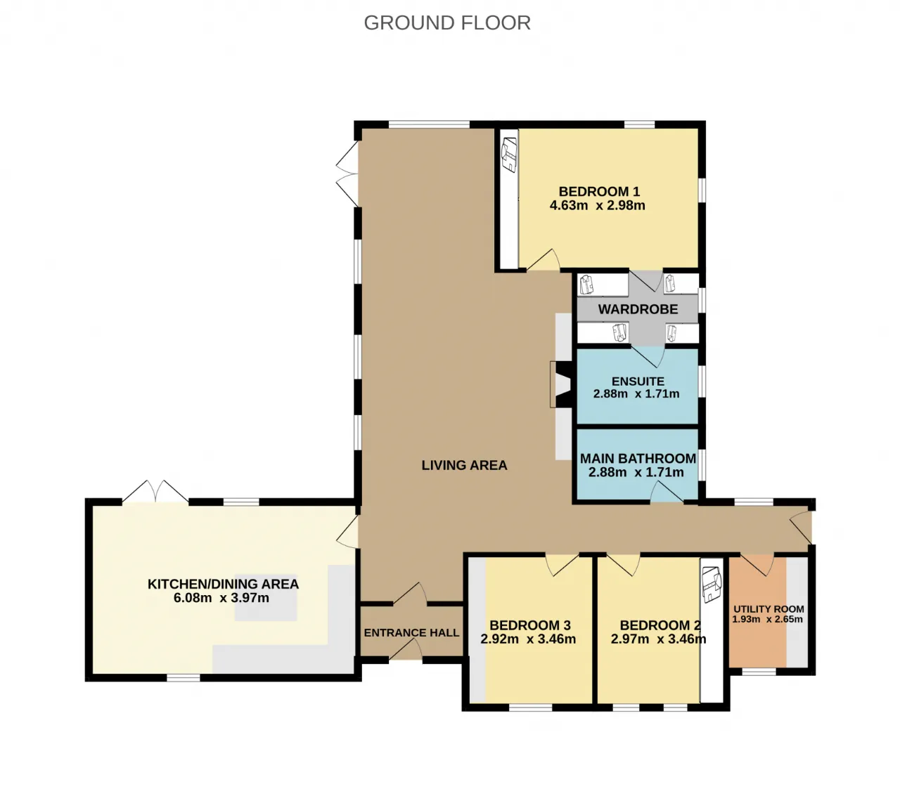Bedroom 1 4.63m x 2.98m This is a large double bedroom to the rear of the home, it benefits from wood flooring, built in wardrobes, a walk-in wardrobe and an ensuite.