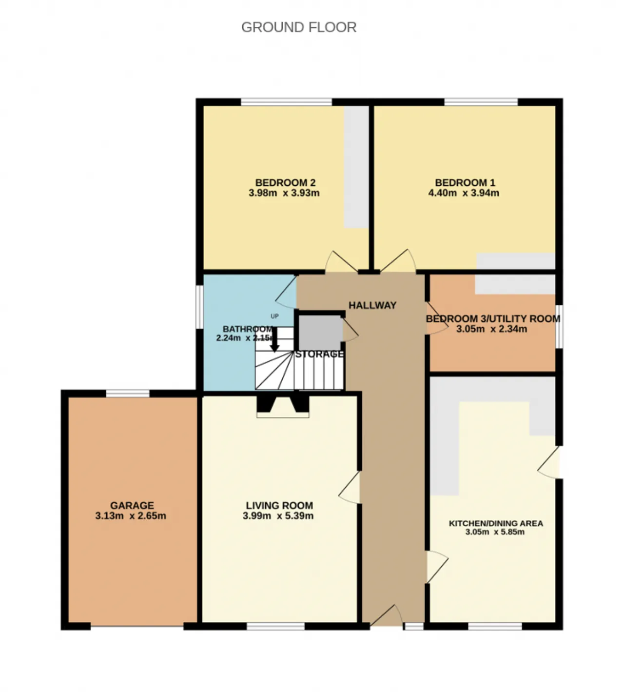 Garage 3.13m x 2.65m This large garage is connected to the side of the home and is currently being used as a storage space. It could potentially be used as an office space, extra living area or for a business (subject to planning).