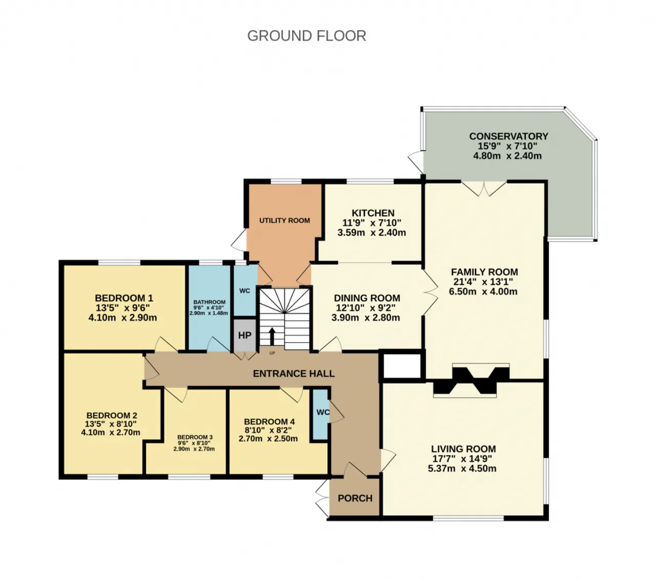 Family room 6.50m x 4.00m Large livings space with log burning stove with marble heart, with double doors leading to conservatory