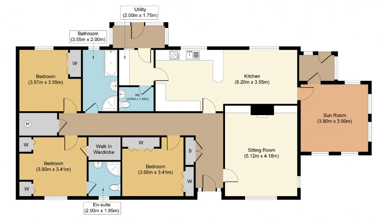 Entering the house the front sitting room has an open stone fireplace and built in cabinets. The kitchen / dining area has substantial built in units with a breakfast bar, polished stone worktops and integrated appliances. Off this area there is a sunroom with substantial glazing and a solid fuel stove that takes advantage of the south and west facing aspects of the house. The kitchen is complimented by a utility room that is plumbed for a washing machine and dryer and there is a glazed conservatory rear porch off this.