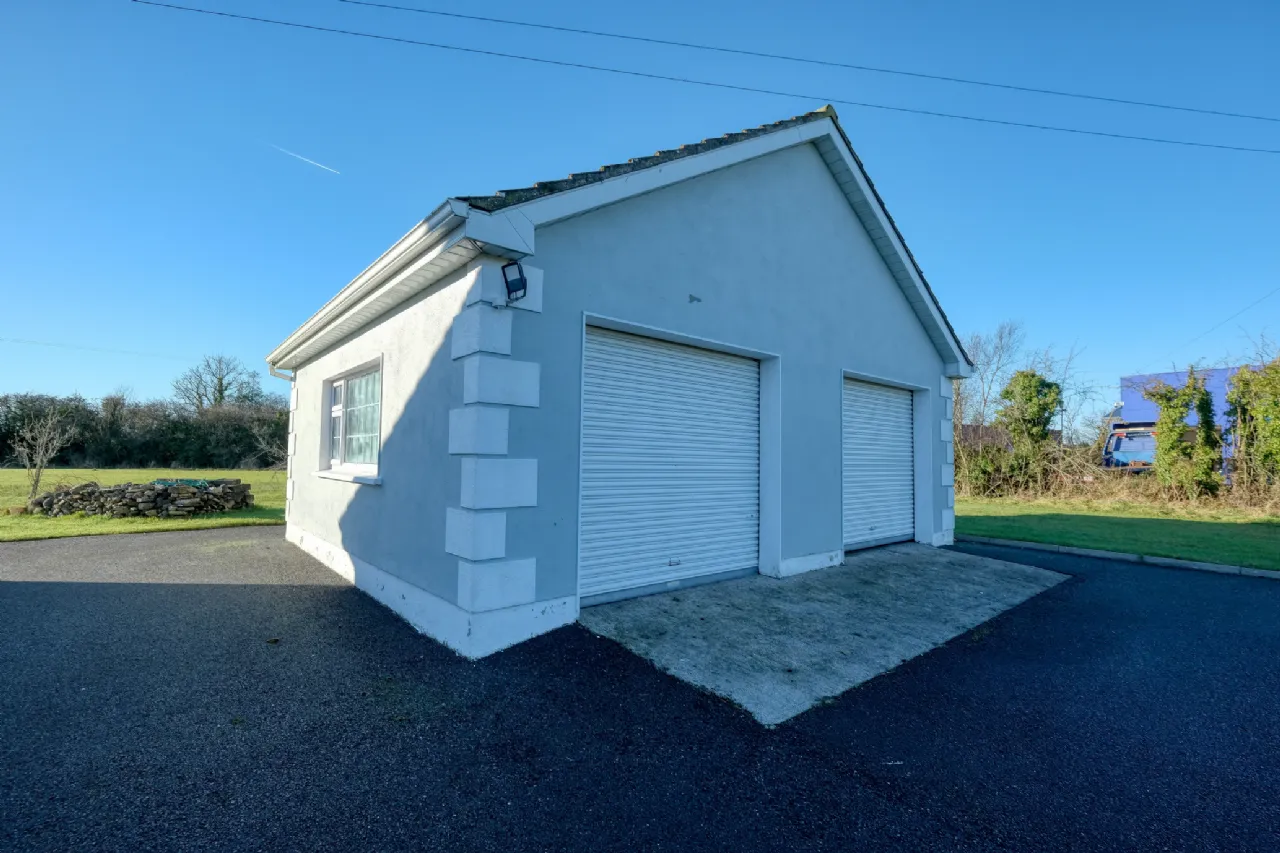 The house is set back from the road with a long tarmac driveway and a detached double garage of c. 42 square meters.