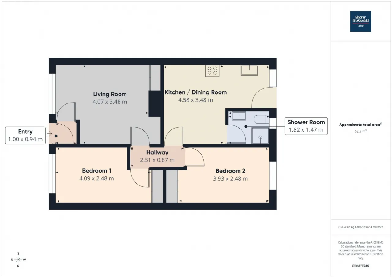 The home is presented in good condition throughout and extends to approximately 52.9 sq. m and is presented in good condition throughout. The layout comprises an entrance porch area leading into a bright living room positioned to the front of the property. To the rear is a well-proportioned kitchen/dining room providing ample space for cooking and dining. A central hallway gives access to two double bedrooms, with Bedroom 1 measuring 4.09m x 2.48m and Bedroom 2 measuring 3.93m x 2.48m, both offering comfortable accommodation. The property is completed by a fully fitted shower room with shower, WC, and wash hand basin.