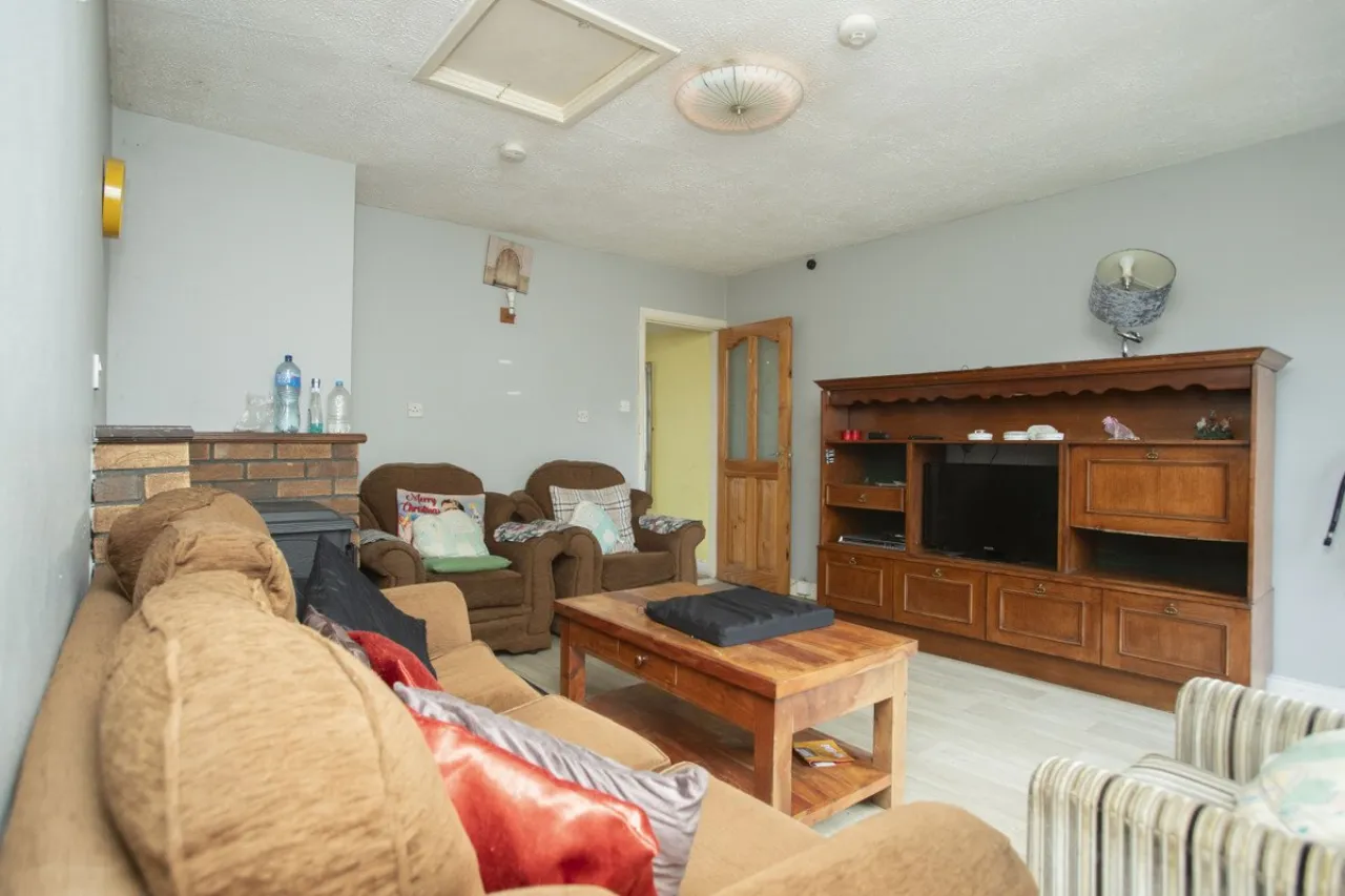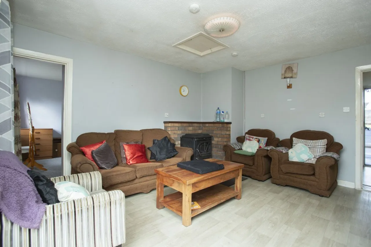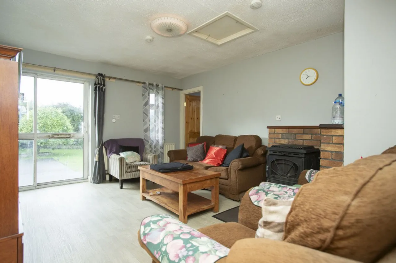 Living Room 4.62m x 3.89m Lino flooring, patio door to rear garden, TV point, attic access, solid fuel stove with brick surround.