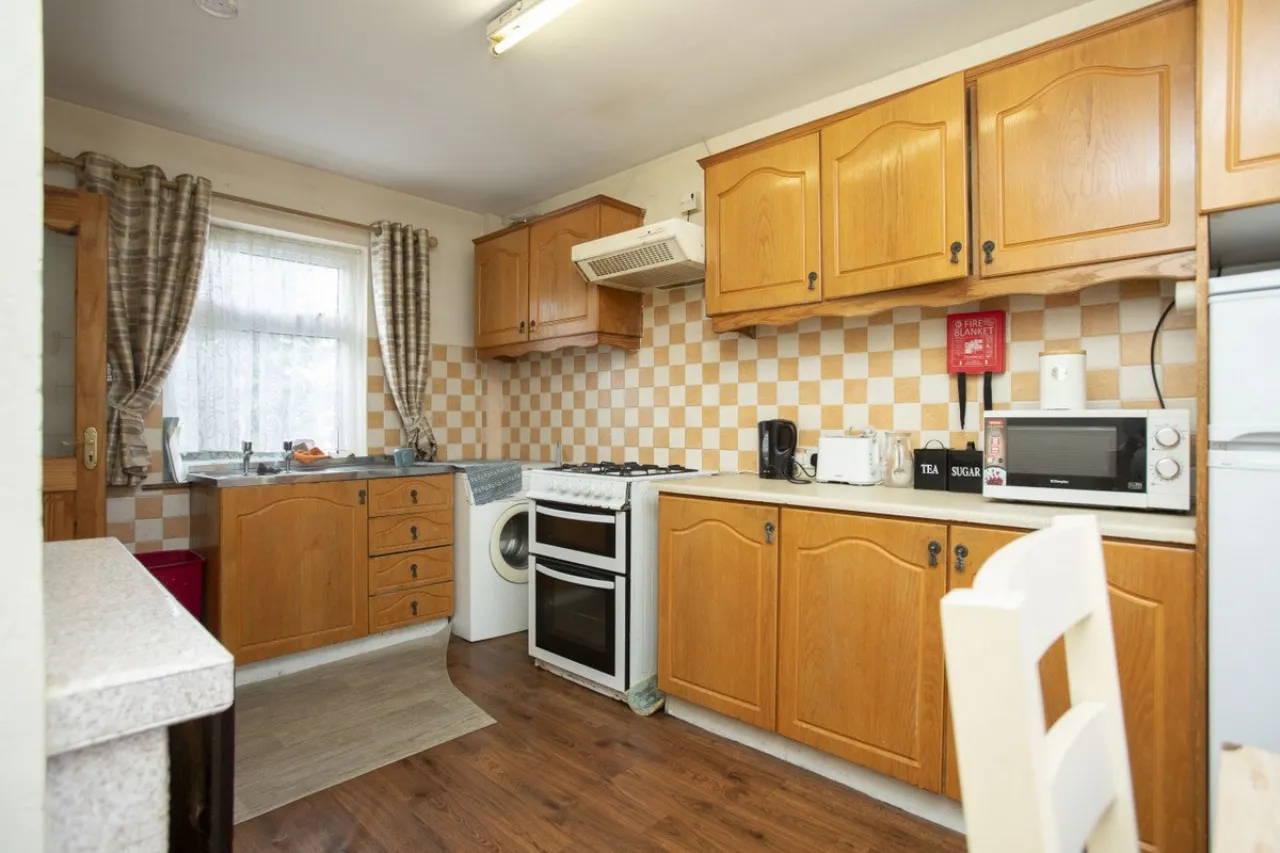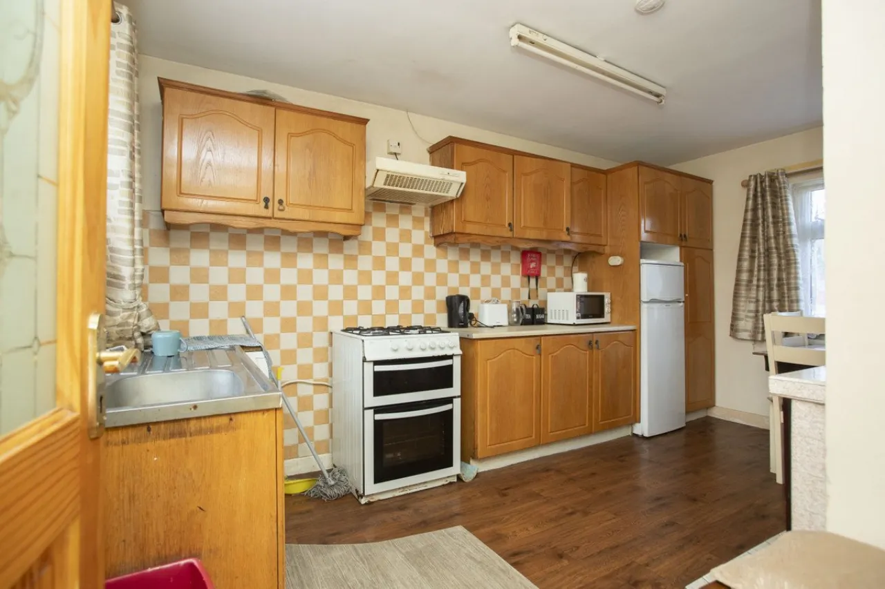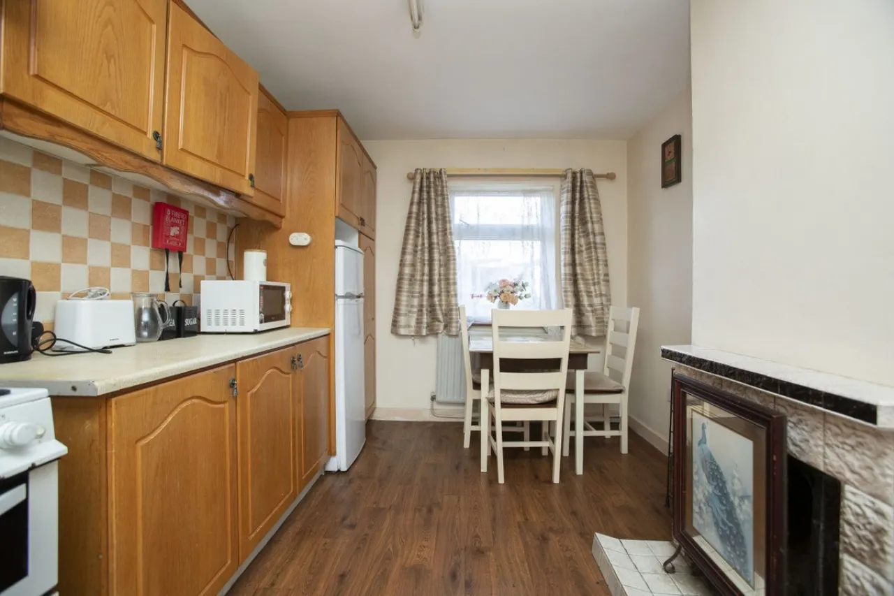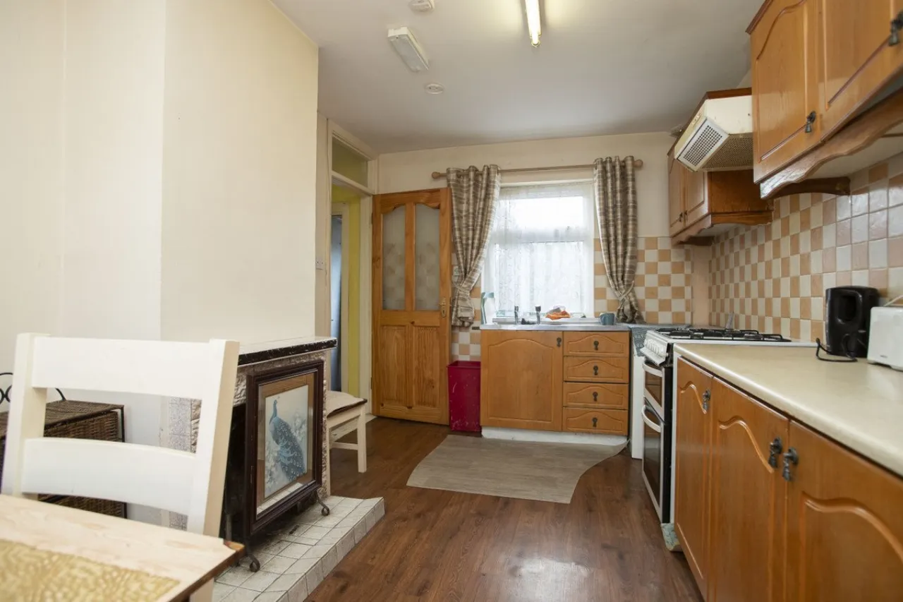 Kitchen 2.75m x 4.85m Fully fitted kitchen with oven, extractor fan, fridge/freezer, stove with tiled surround, wall tile.