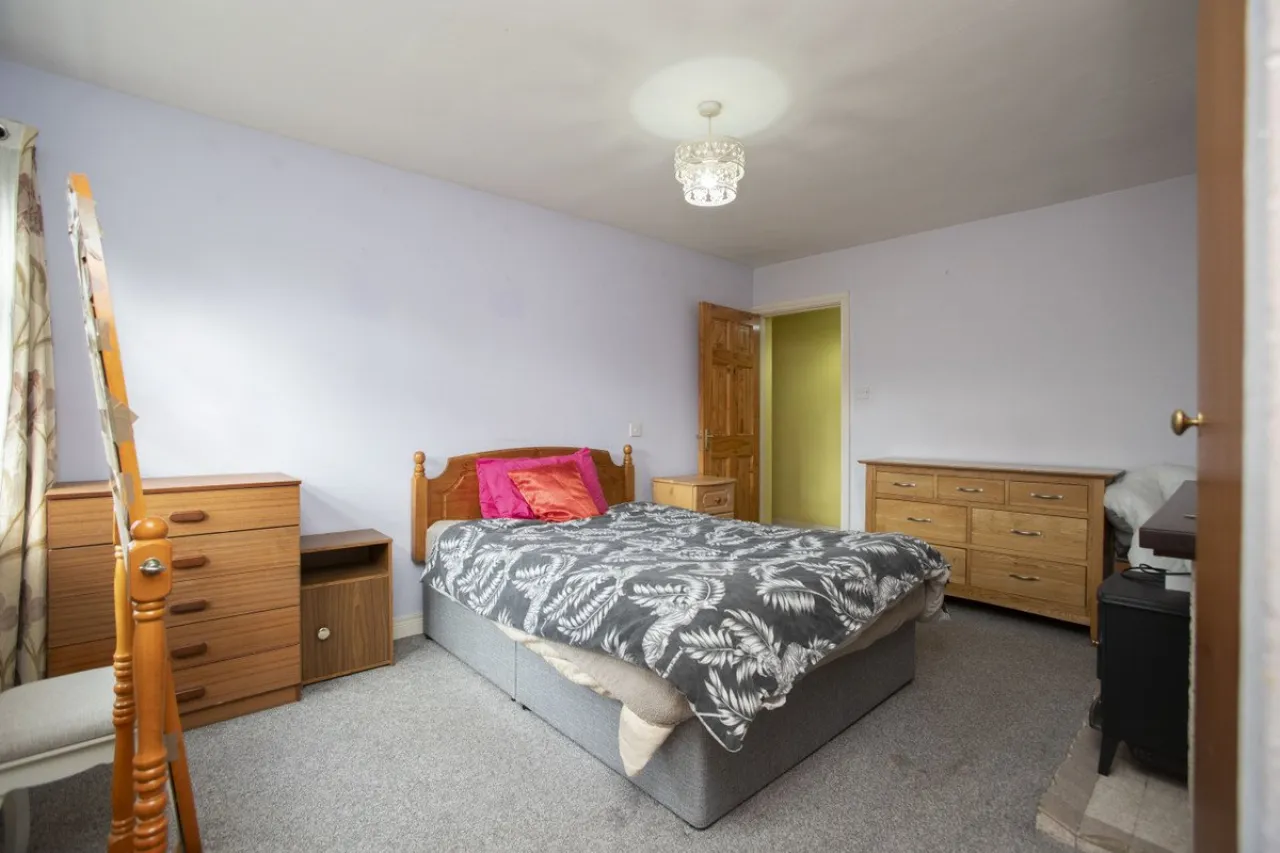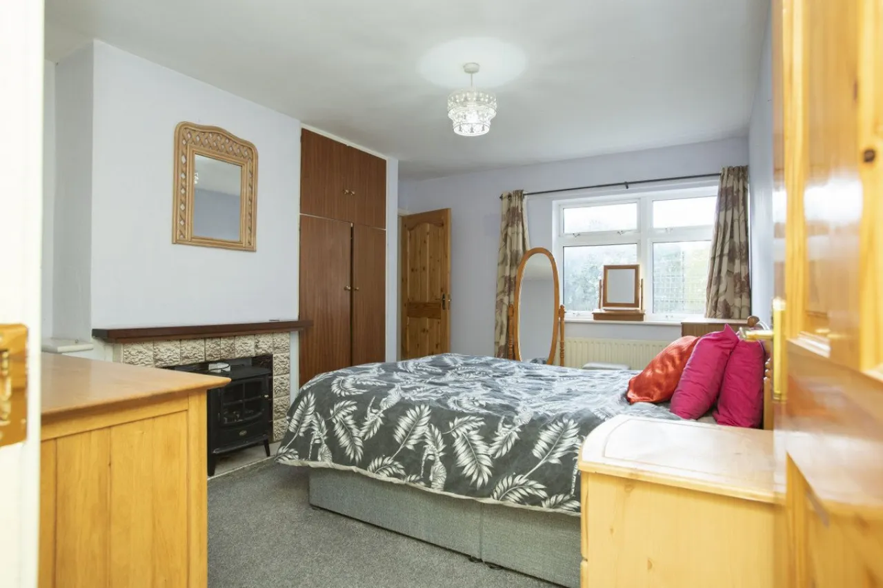 Bedroom one 4.62m x 3.41m Carpet, built in wardrobe, stove with tile surround.