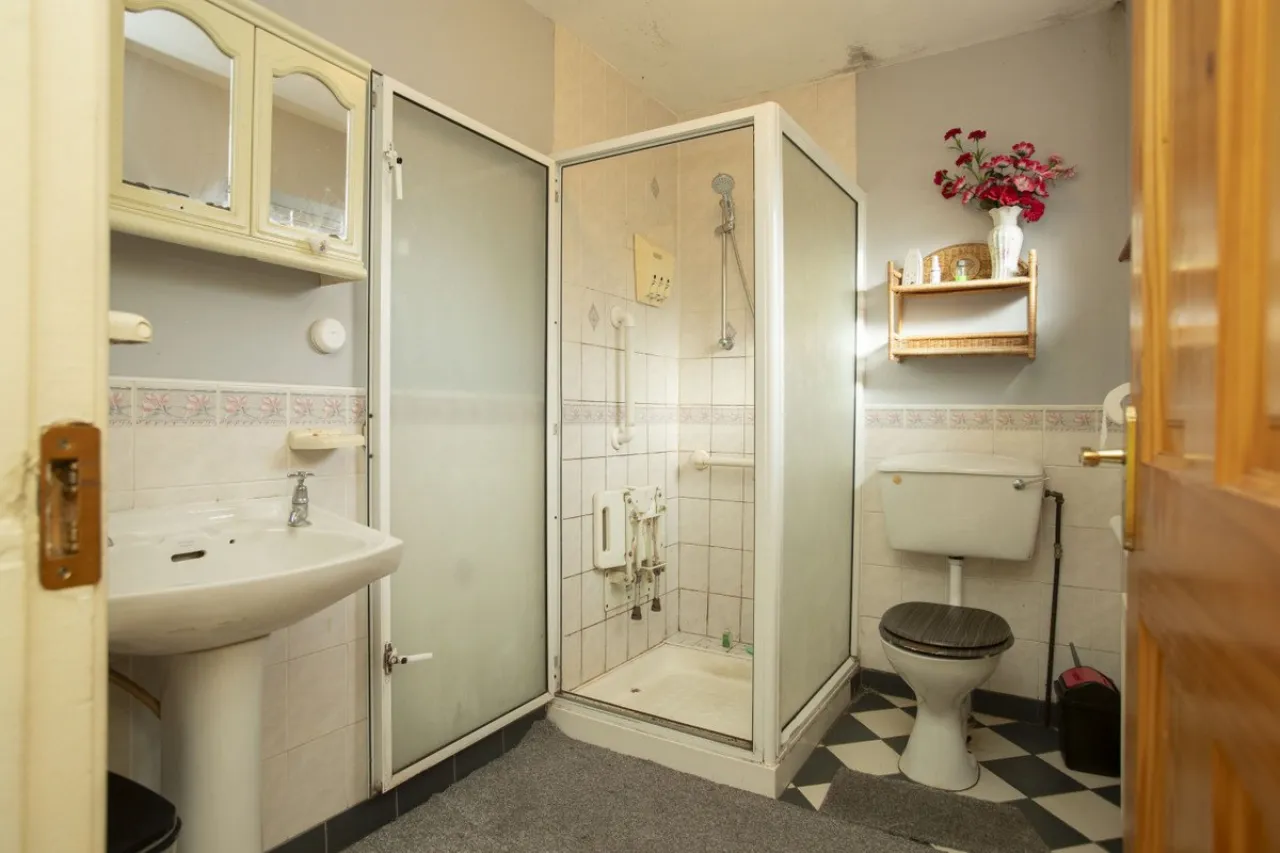 Bathroom 1.66m x 2.50m WC, wash hand basin, tiled flooring, wall tile, electric shower with shower chair, fitted cabinets.