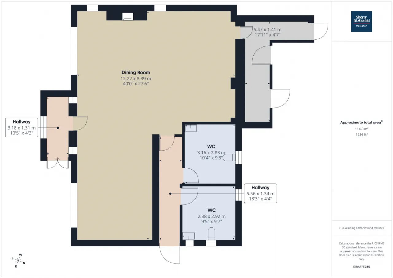 Hallway 5.56m x 1.34m Tiled flooring, access to the toilets and outdoor area