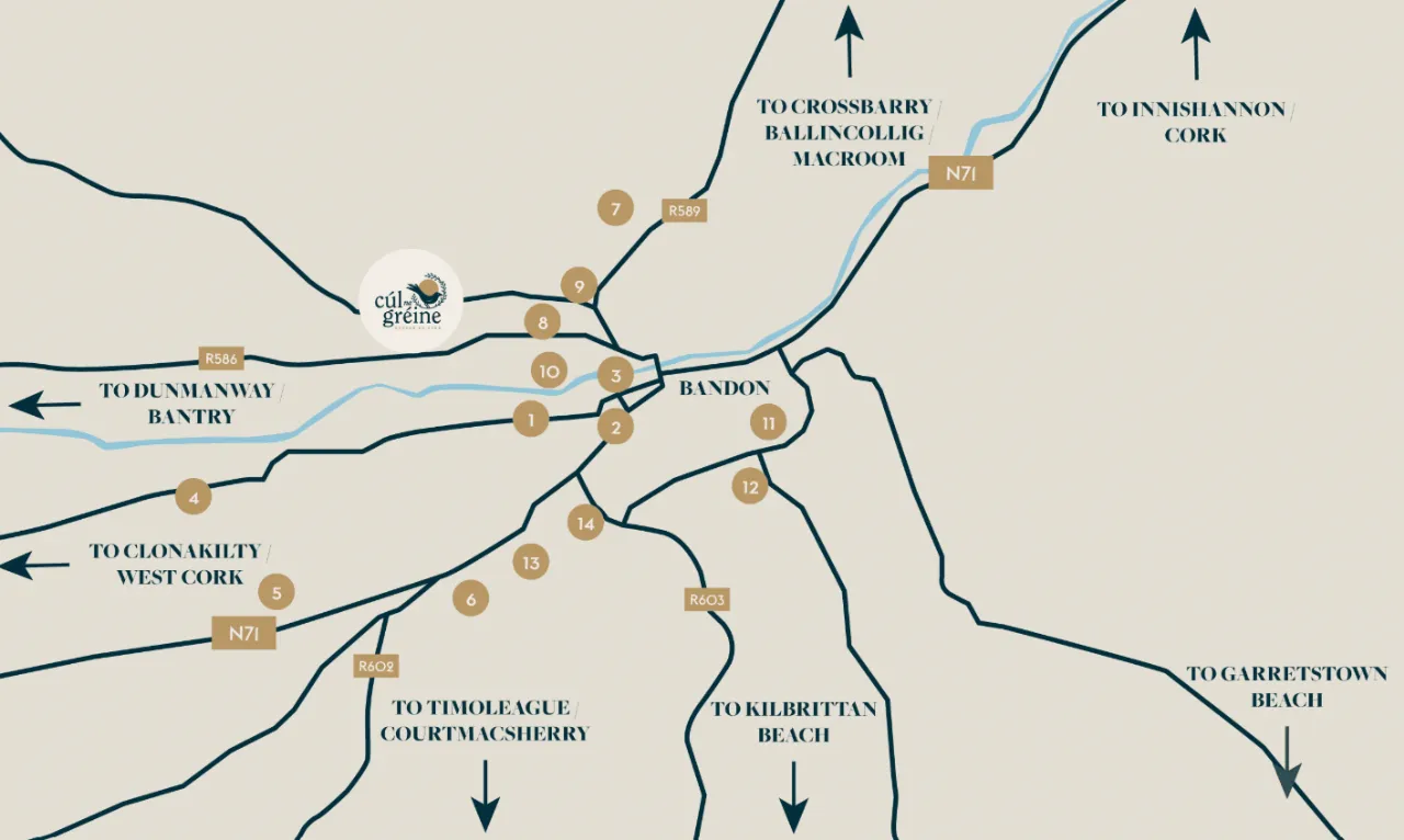 Bandon is a hugely attractive suburb, just 20 miles west of Cork City. It is commonly known as the gateway to West Cork. Bandon is in the heartland of some of the richest and most beautiful farmland in the country, and lies just a 10 minute drive away from some of Ireland’s most spectacular coastline. Due to its proximity to Cork City, the town has seen a huge amount of development take place in recent years.