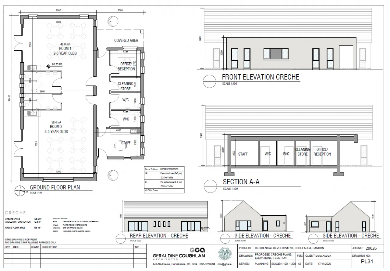 The facility, when complete, will extend to 178 sq m (1,916 sq ft) over a single floor in addition to an external secure play area. There are 6 designated car parking spaces provided for the creche facility. The building can cater for approx. 43 children. The plans designed initially accommodate 2 large class/nursery rooms, a reception/office, staff room, cleaning store and w/c facilities.