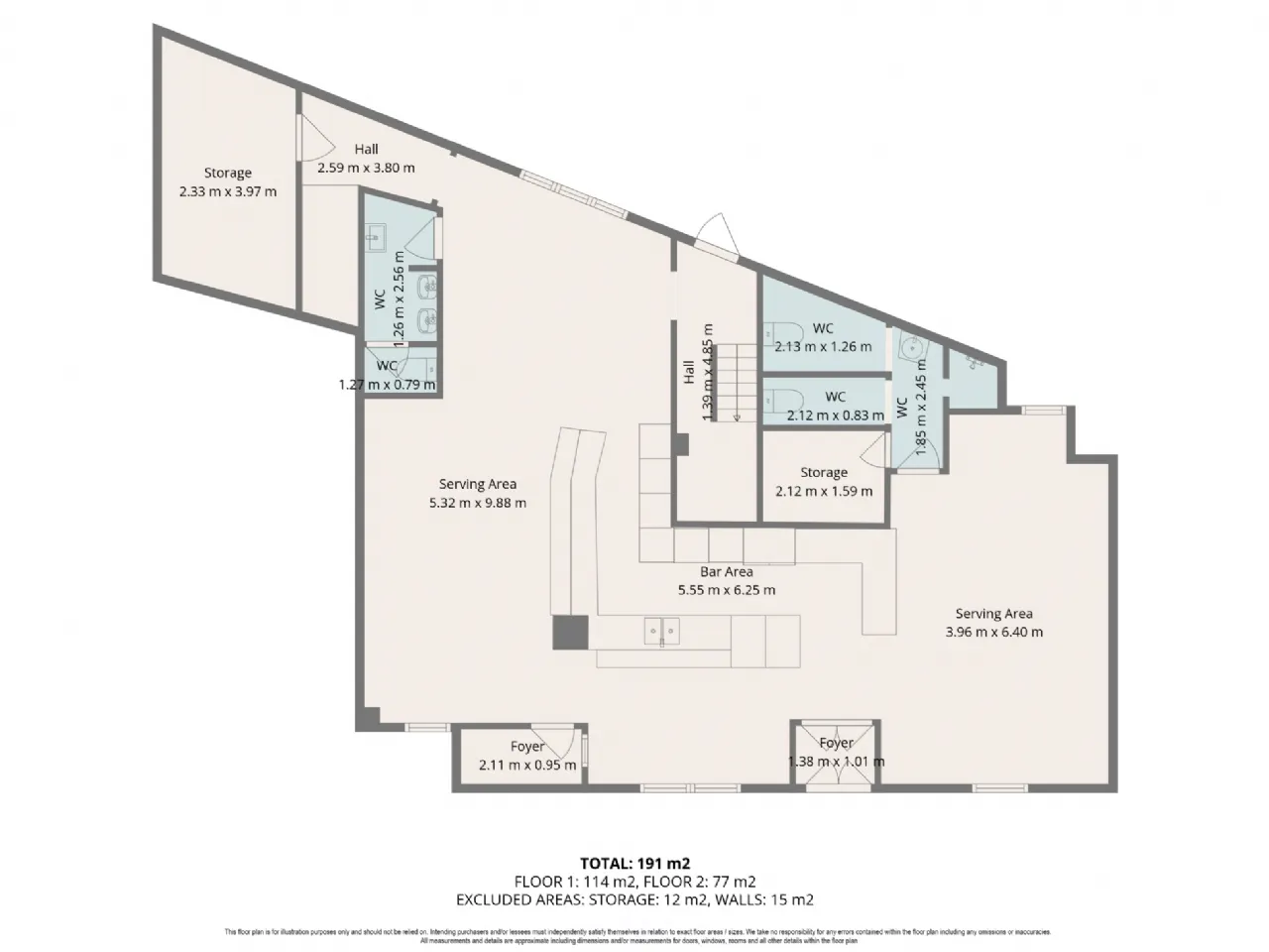 Accommodation downstairs includes; the old bar and lounge, ladies and gents toilets and a storeroom and coldroom, upstairs includes a bathroom, kitchen-living area, 2 bedrooms and a 32.4 sqm space currently divided into 4 rooms.