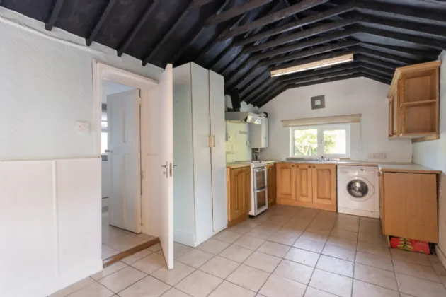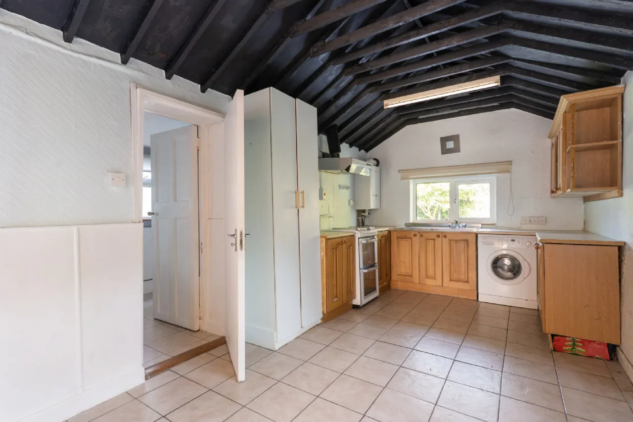 Kitchen 5.35m x 2.81m Steps down into a pitched roof kitchen with original wood beams. Built in floor to ceiling units, tiled flooring. Dual aspect windows.