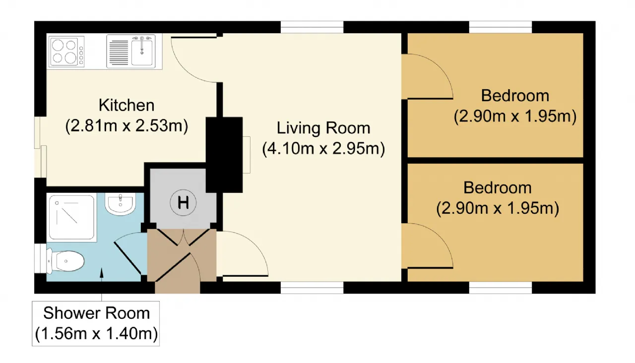 There is a central living room area with an open fireplace and off this is a small kitchen with some built in units. There are two small bedrooms and a small shower room.