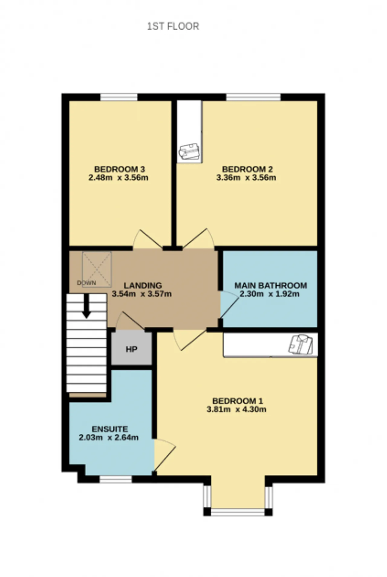 Bedroom 1 4.30m x 3.81m Generously sized bedroom that features a bay window overlooking the front of the property. Fitted wardrobe allows for additional storage and there is access into the ensuite.