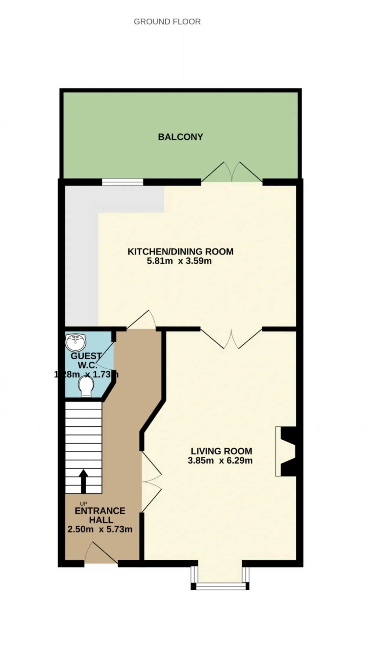 Guest W.C. 1.73m x 1.28m Located under the stairs is a spacious and partially tiled two-piece suite.