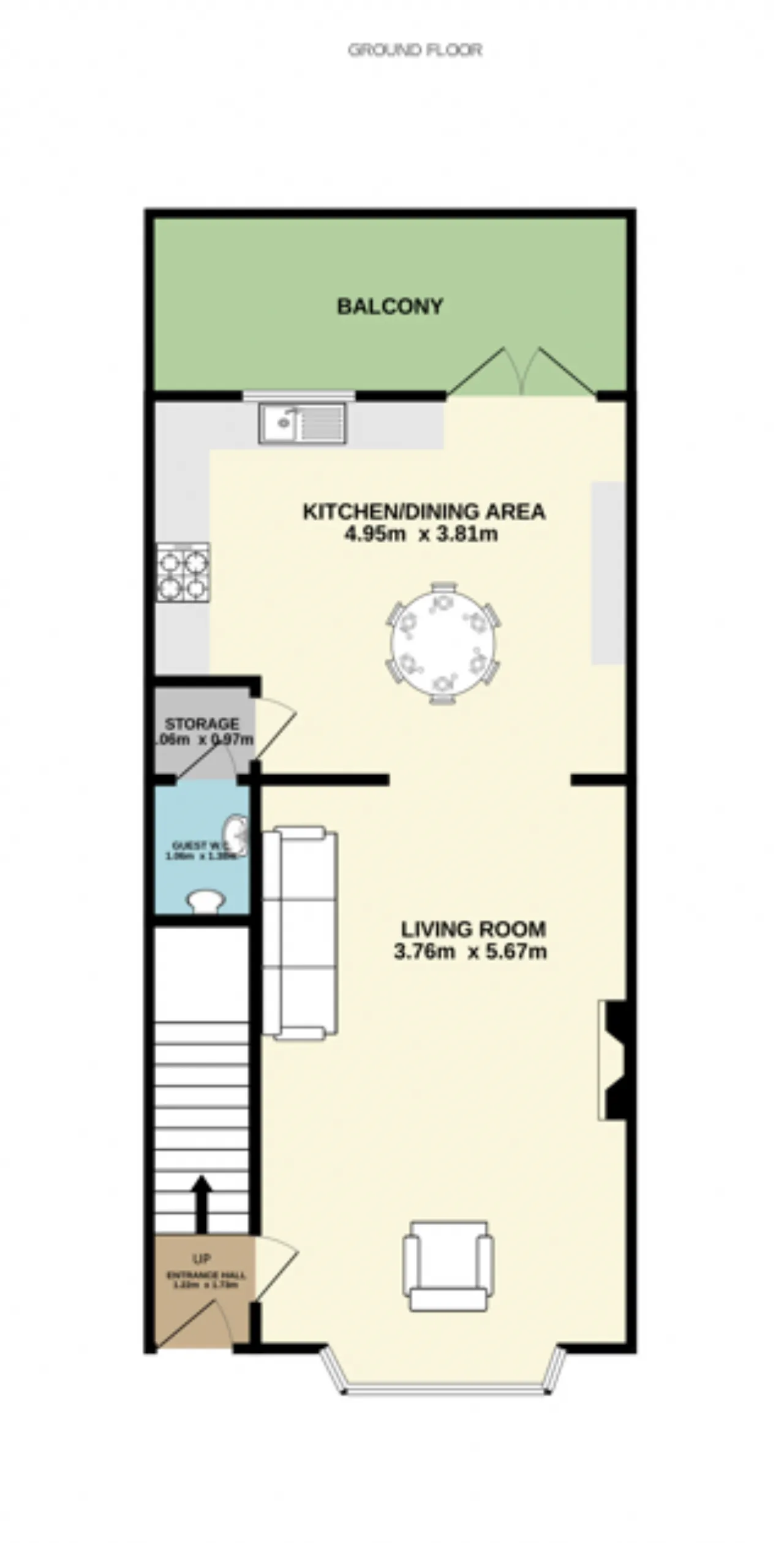 Kitchen/Dining Area 4.95m x 3.81m An open plan contemporary style kitchen/dining room that is well equipped with both floor and eye level units. It features a tiled splash back, porcelain tiled flooring, a brand-new combi boiler and one window that overlooks the balcony to the rear. There are French doors that lead to the paved balcony area which is an ideal area for outdoor dining.