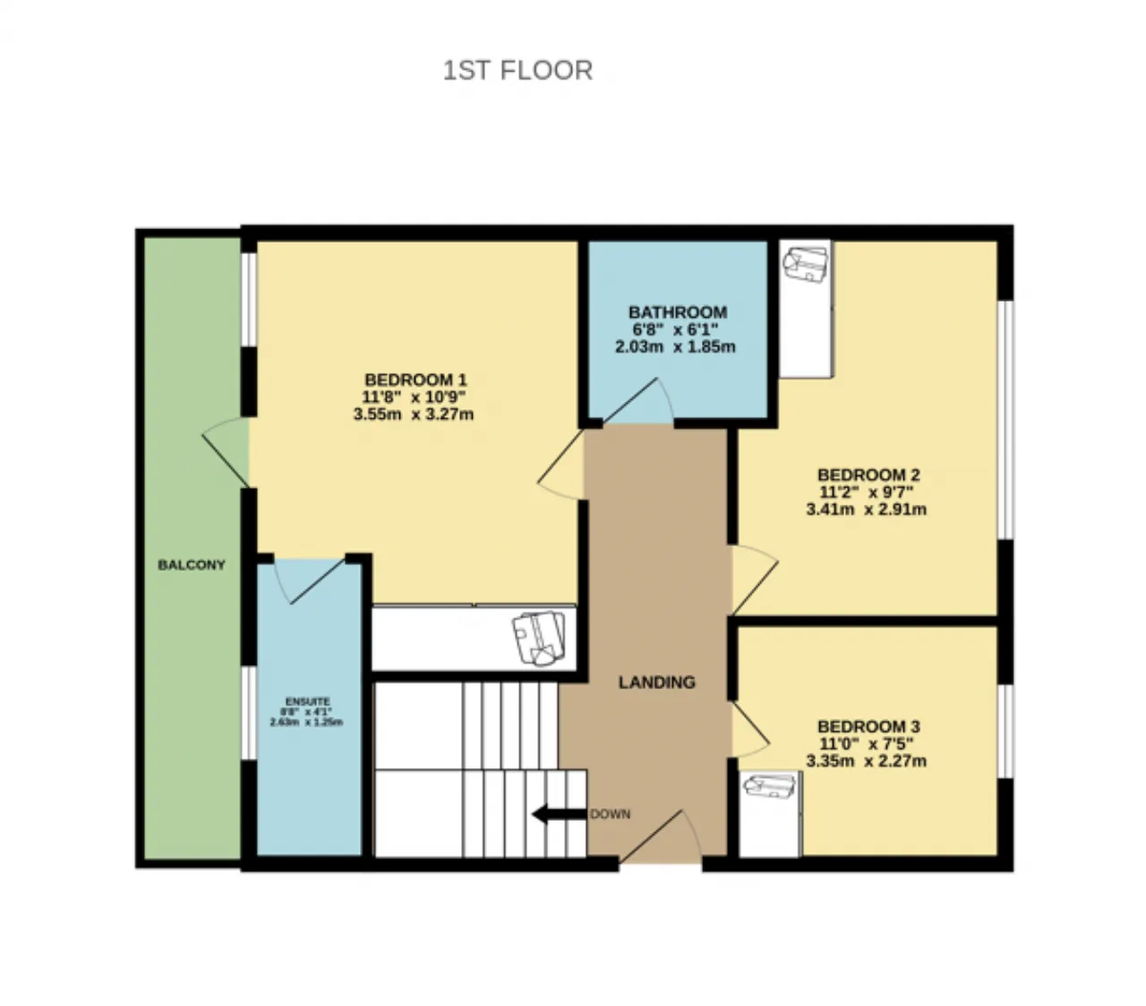 Bedroom 1 3.55m x 3.27m Located at the front of the property, this spacious double bedroom features carpet flooring and a floor-to-ceiling wardrobe. It also boasts an en-suite bathroom and a second large, south-facing balcony, offering plenty of natural light and outdoor space.