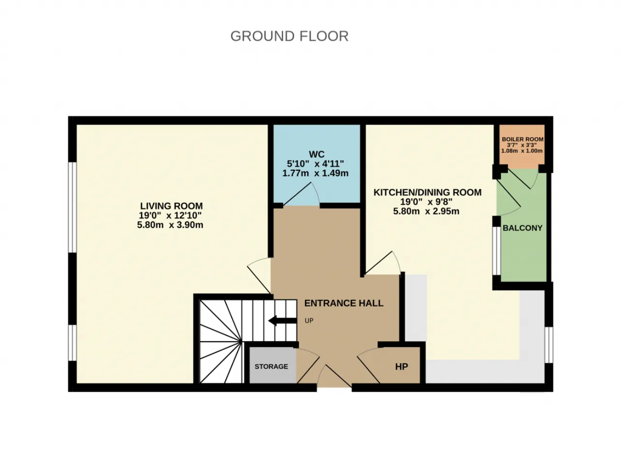 The layout is both practical and family-friendly, featuring a spacious living room to the front, which spans the width of the property. At the rear, the kitchen and dining area also stretches across the full width of the home and opens onto an enclosed, generous balcony overlooking the communal grounds. A large guest WC and plenty of under-stair’s storage complete the downstairs accommodation.