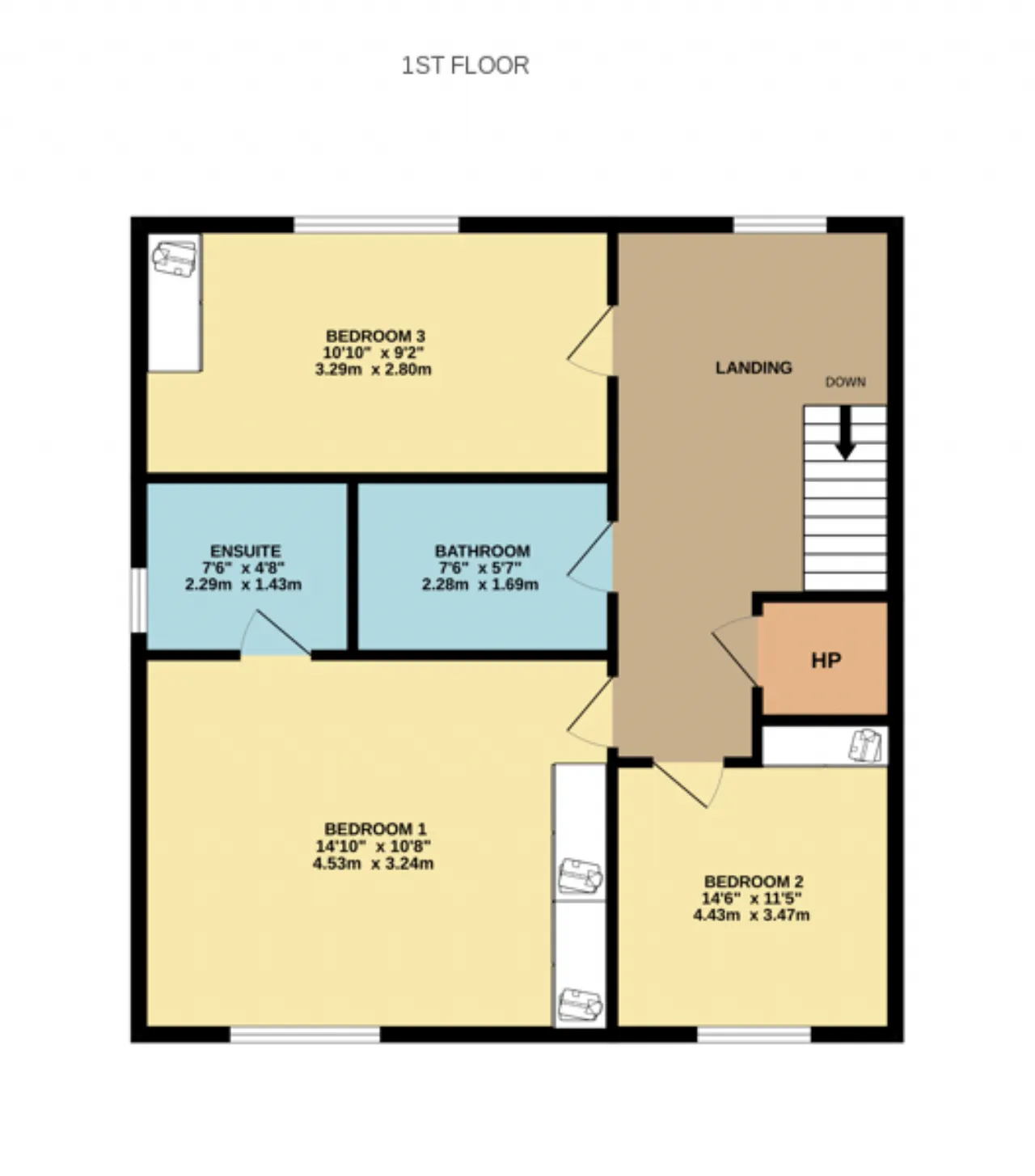 Bedroom 2 4.43m x 3.47m A charming and generous double bedroom to the front, offering laminate flooring, a large picture-frame window, and built-in wardrobe.
