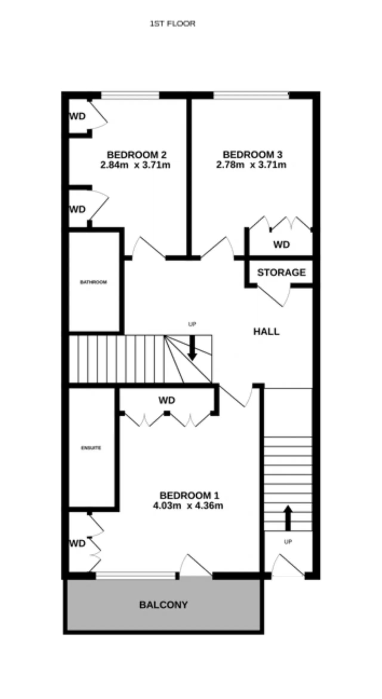 Bedroom 1 4.03m x 4.36m Large double bedroom to the front with access to balcony. Built in floor to ceiling wardrobes. Timber flooring and central lighting.