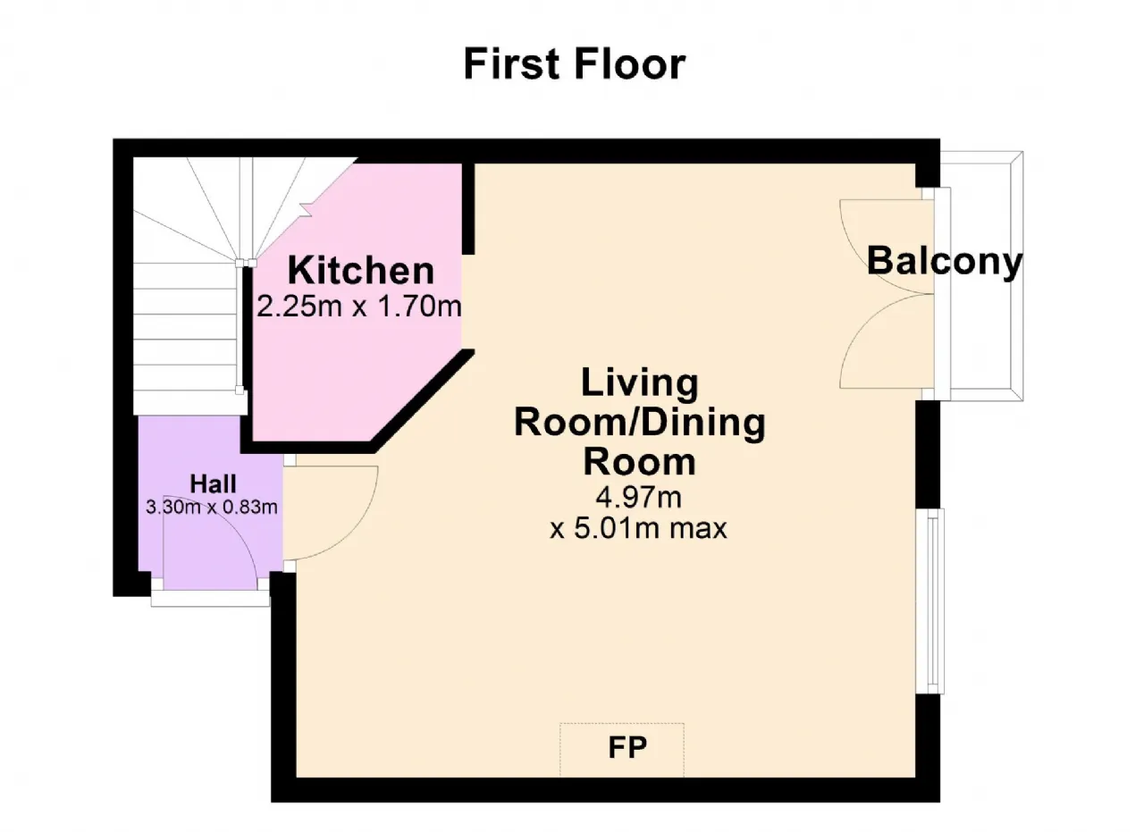 Living/Dining Room 4.97m x 5.01m Laminate wood flooring, centre lights, contemporary granite fireplace with wood burning stove, bespoke wall shelving units, TV point and doors to Juliet style balcony.